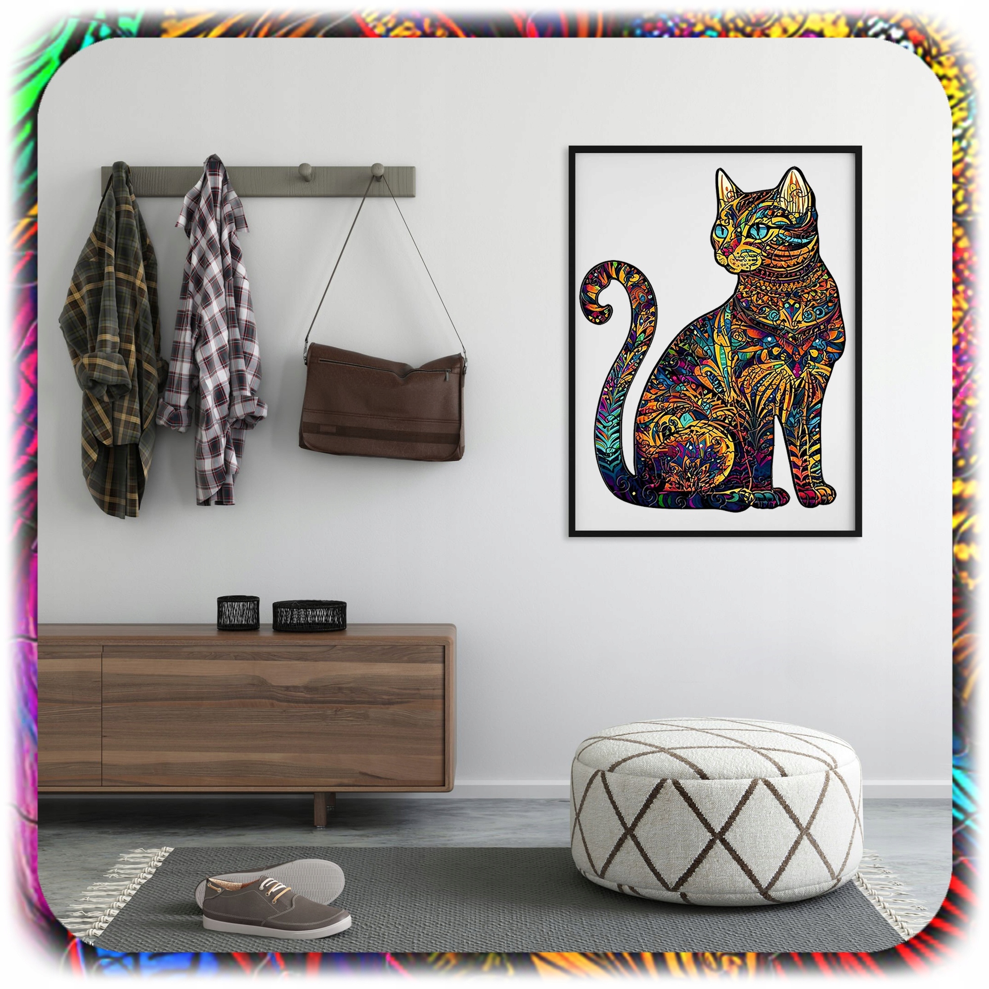 З одного боку: художній кіт у яскравих кольорах.