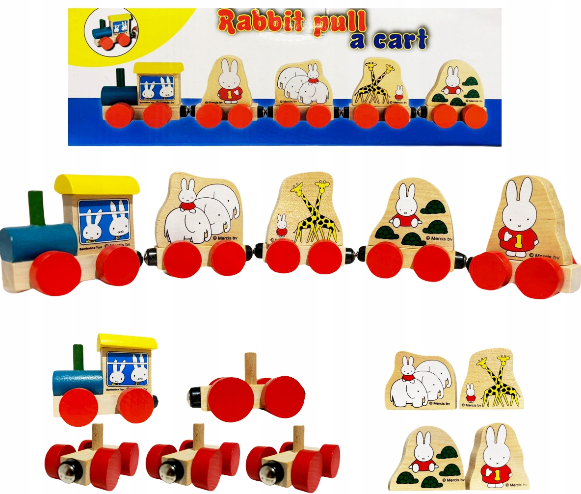 Поїзд виготовлений з дерева. Він складається з 9 елементів: локомотива і 4 вагонів і блоків у формі різних фігурок, прикріплених до шпильок. Вагони можна з’єднати за допомогою магнітів.