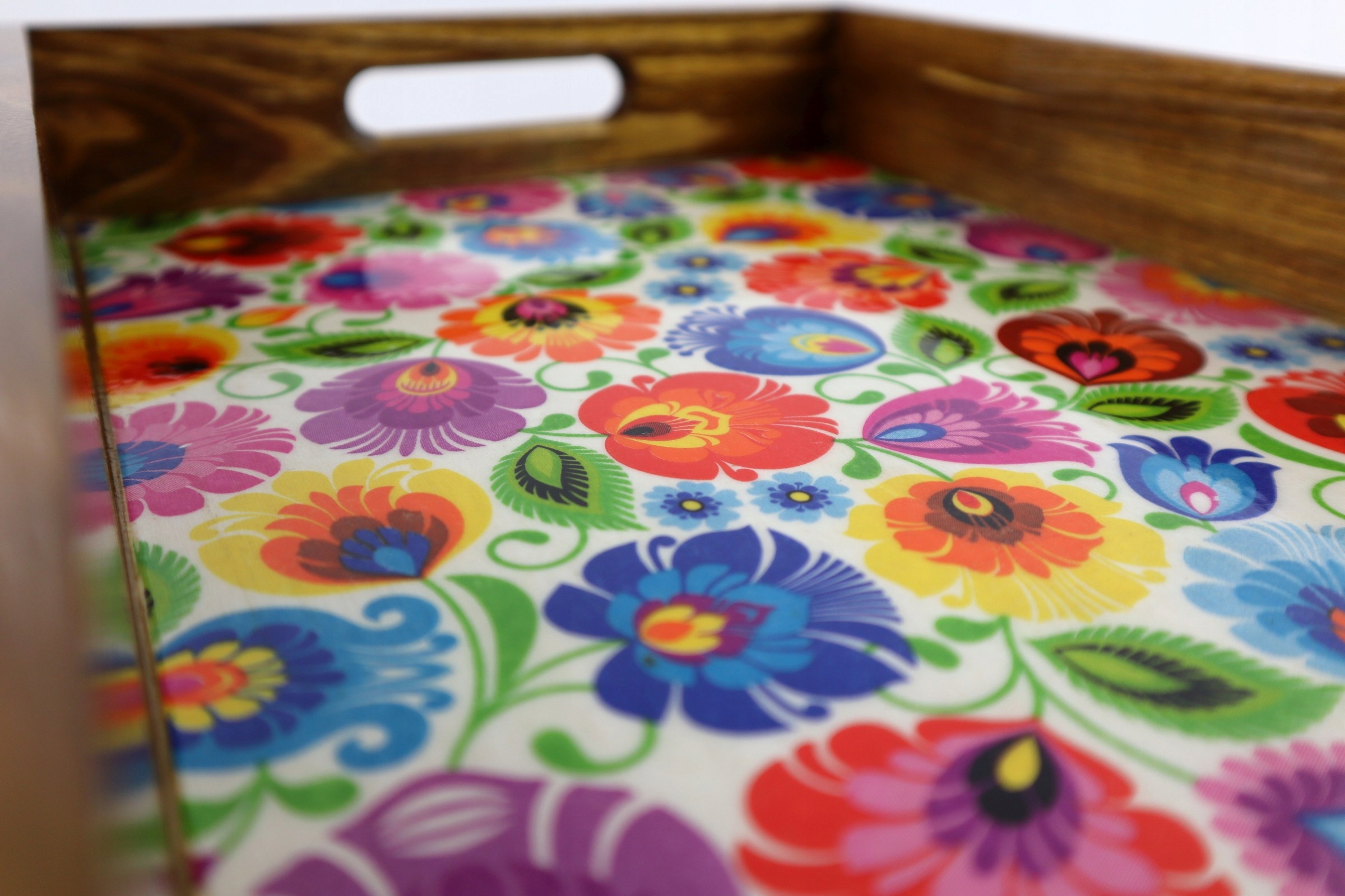Цей унікальний лоток був прикрашений методом декупажу фольклорного малюнка, який надає йому унікального характеру. Квітковий малюнок додає делікатесу та свіжості.