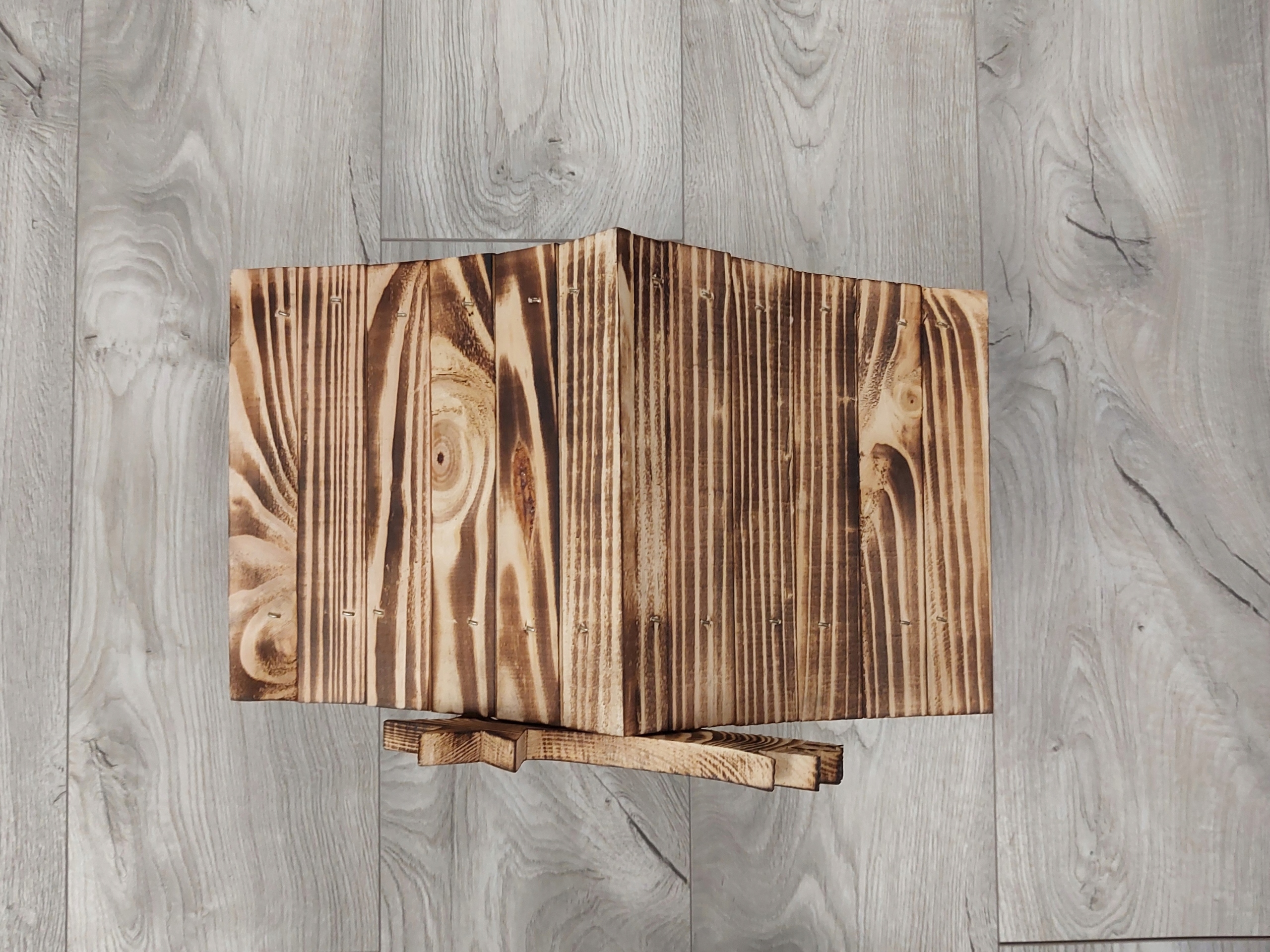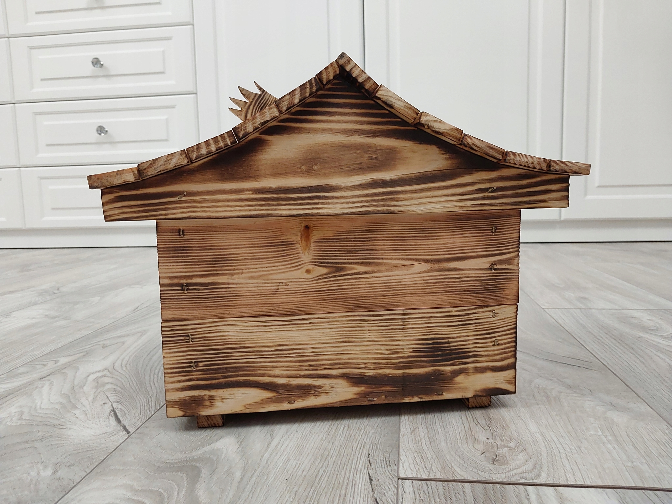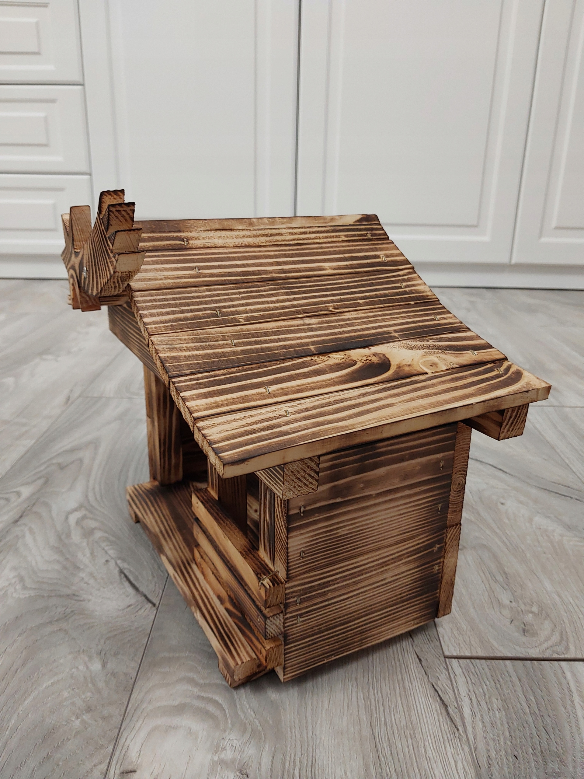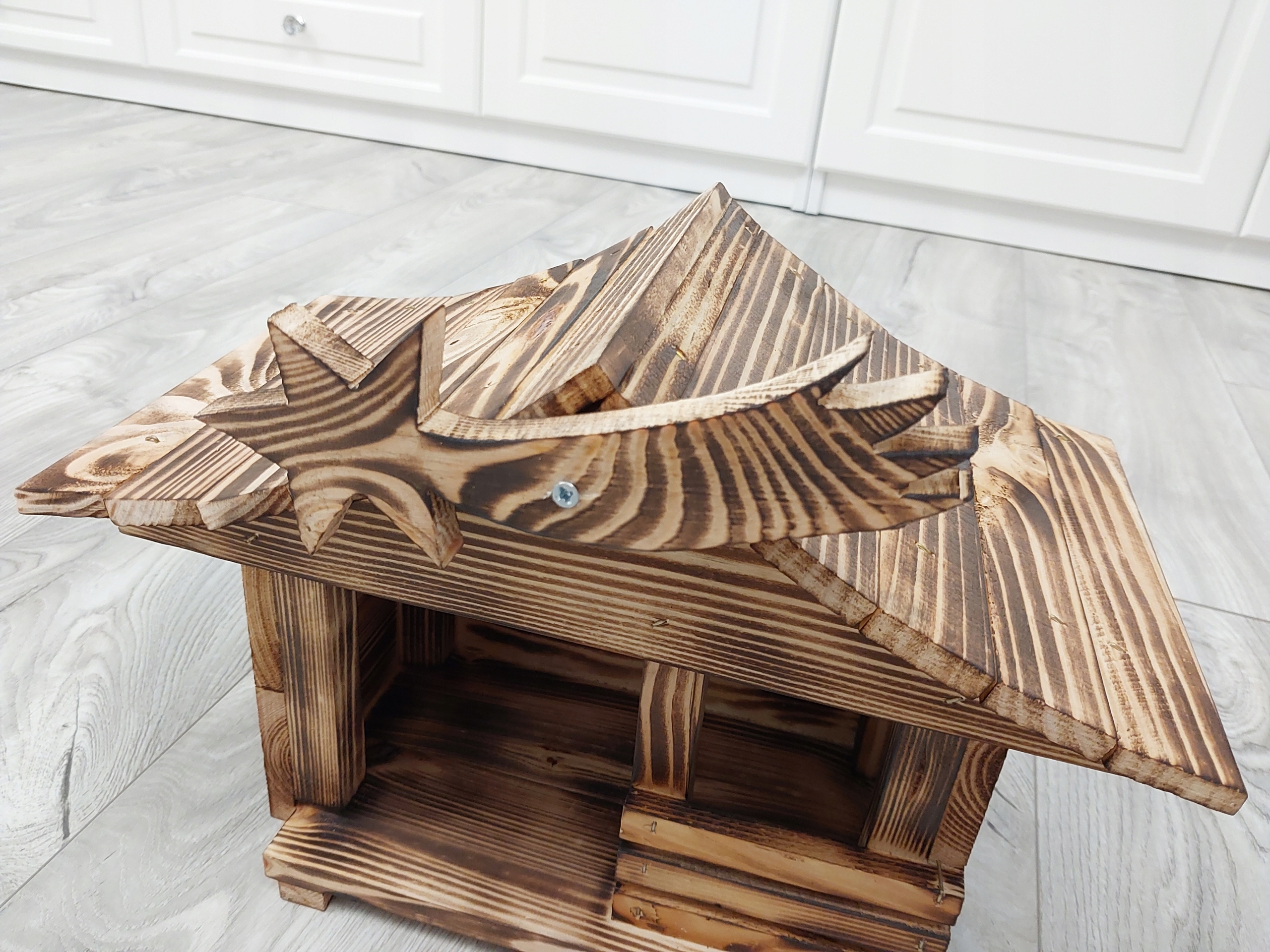 Вертеп виготовлений вручну з високоякісної обвугленої деревини сосни, що робить конструкцію дуже довговічною та забезпечує її міцність. Зарядка робить деревину красивою та унікальною. Кожен вертеп надзвичайний і унікальний