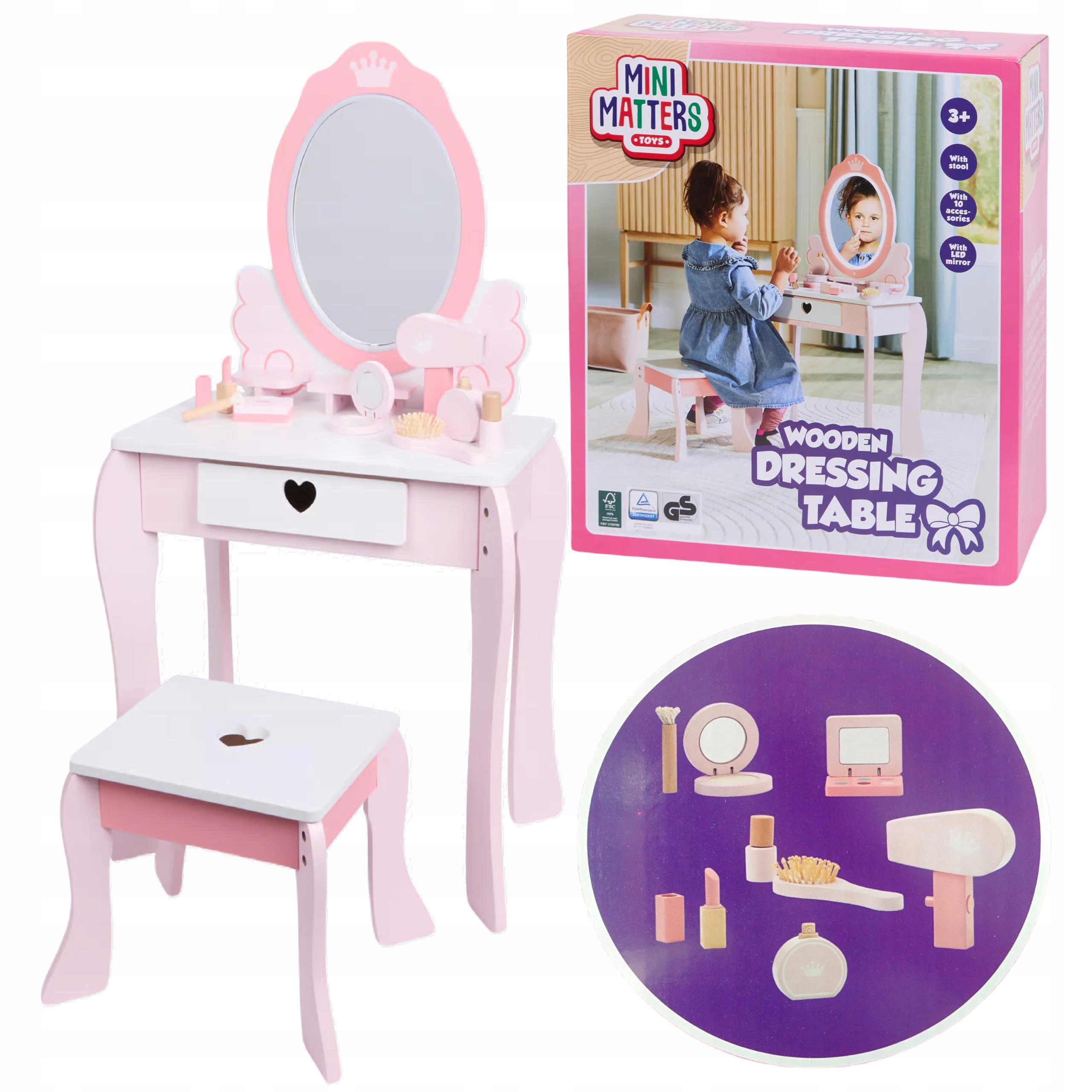 ДЕРЕВ'ЯНИЙ ТУАЛЕТНИЙ СТОЛИК ДЛЯ ДІВЧИНКИ, ДЗЕРКАЛО + 6 АКСЕСУАРІВ