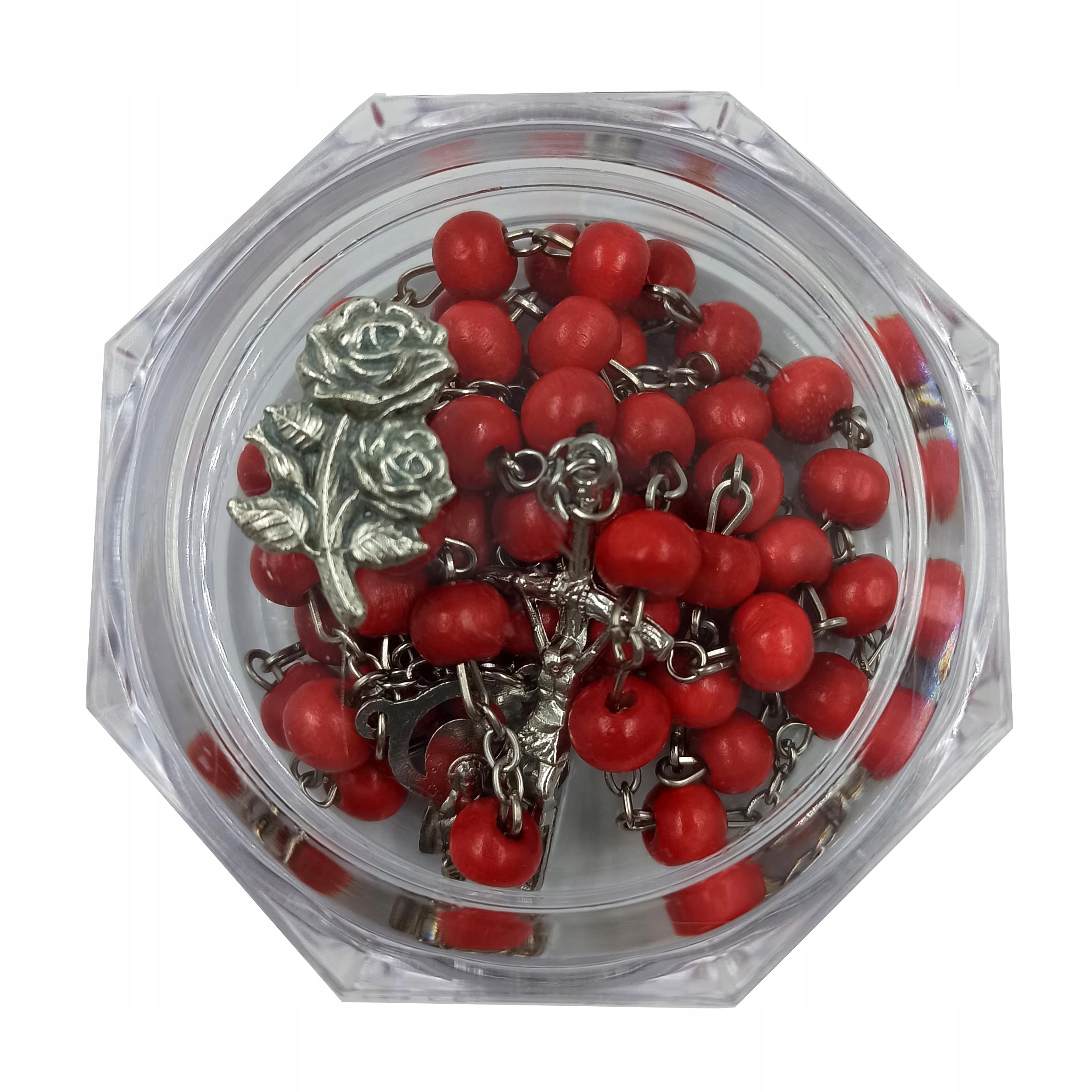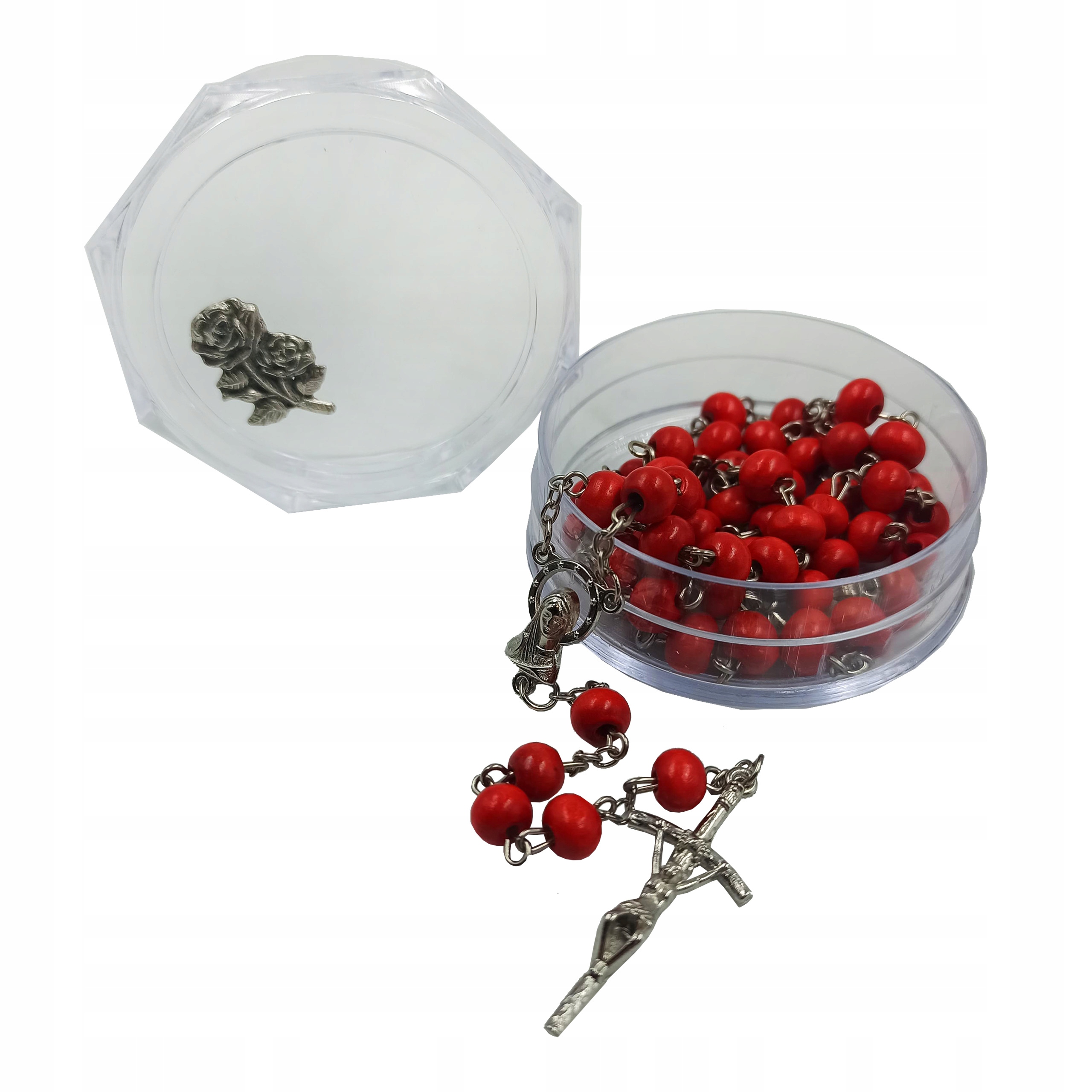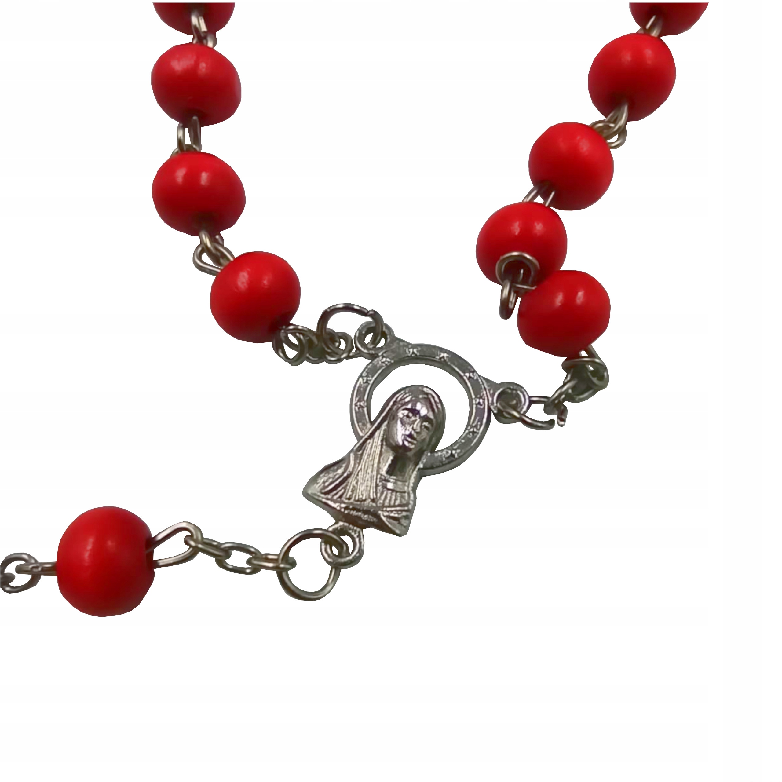 Четки дерев'яні з ароматом з металевими елементами. Червоні чотки виготовлені з дерева, а ланцюжок, з’єднувач у вигляді образу Марії та папського хреста – з металу.