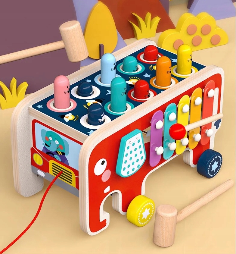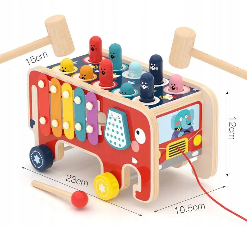- чудова іграшка для вашого малюка - це справжня шахта можливостей! Цей чарівний дерев'яний слоник - хіт серед розвиваючих іграшок. Оснащений 4 рухомими коліщатками та зручним шнурком для перетягування, завжди готовий до розваг! Слоник - це скарбниця знань і радості - з одного боку пронизлива гра з парами тварин, які з'являються один навпроти одного, а з іншого - шестерінки, які порадують кожну дитину. Раз, два, три — і всі разом вештаються! А може ваша дитина воліє стати маленьким музикантом? Просто пройдіть по той бік слона, щоб побачити чудові 5-тонні тарілки. Гра на музичних інструментах - це велика розвага для дітей, яка розвиває їхні почуття та концентрацію. У коробці також є все необхідне: два молоточка і тарілка. Ця чудова іграшка - чудова ідея для подарунка, упакована в барвисту коробку. Проведіть час зі своєю дитиною, тренуючи її фізичну форму та навички!