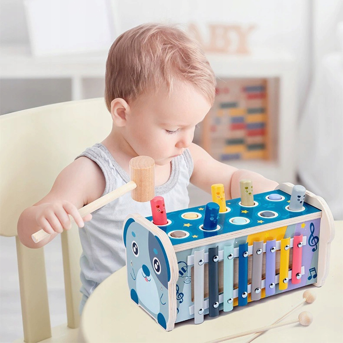 ✅НАВЧАЛЬНА ТА РАДІСТЬ: проста, але повна дерев’яна іграшка в стилі Монтессорі для малюків віком від 12 місяців! Удар молотом розвиває координацію рук і очей, дрібну моторику і силу рук. 8-нотний ксилофон стимулює розпізнавання звуків і музичну цікавість. Цифрові головоломки розвивають навички рахунку та стимулюють когнітивний розвиток, підтримуючи цілісний розвиток через веселу гру.