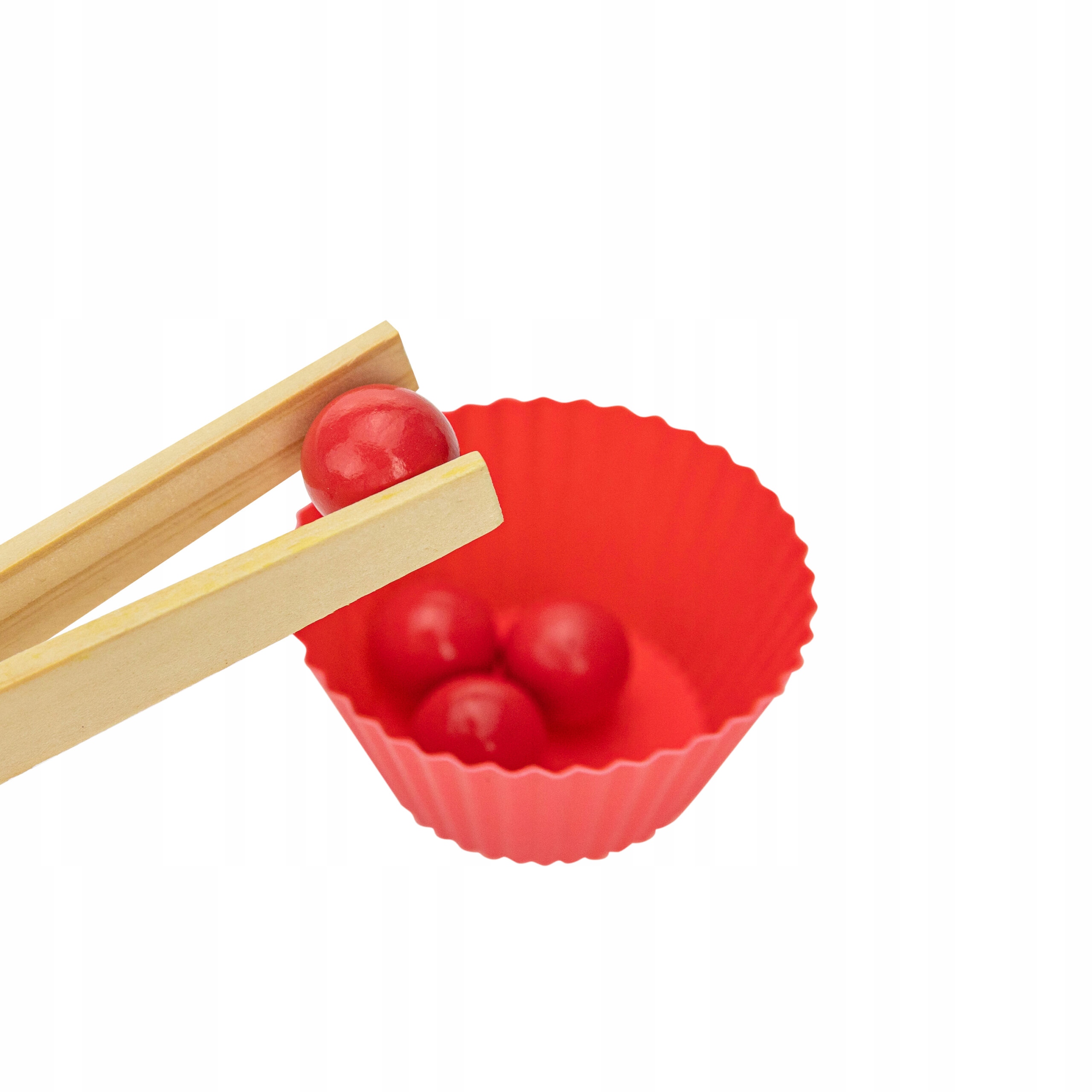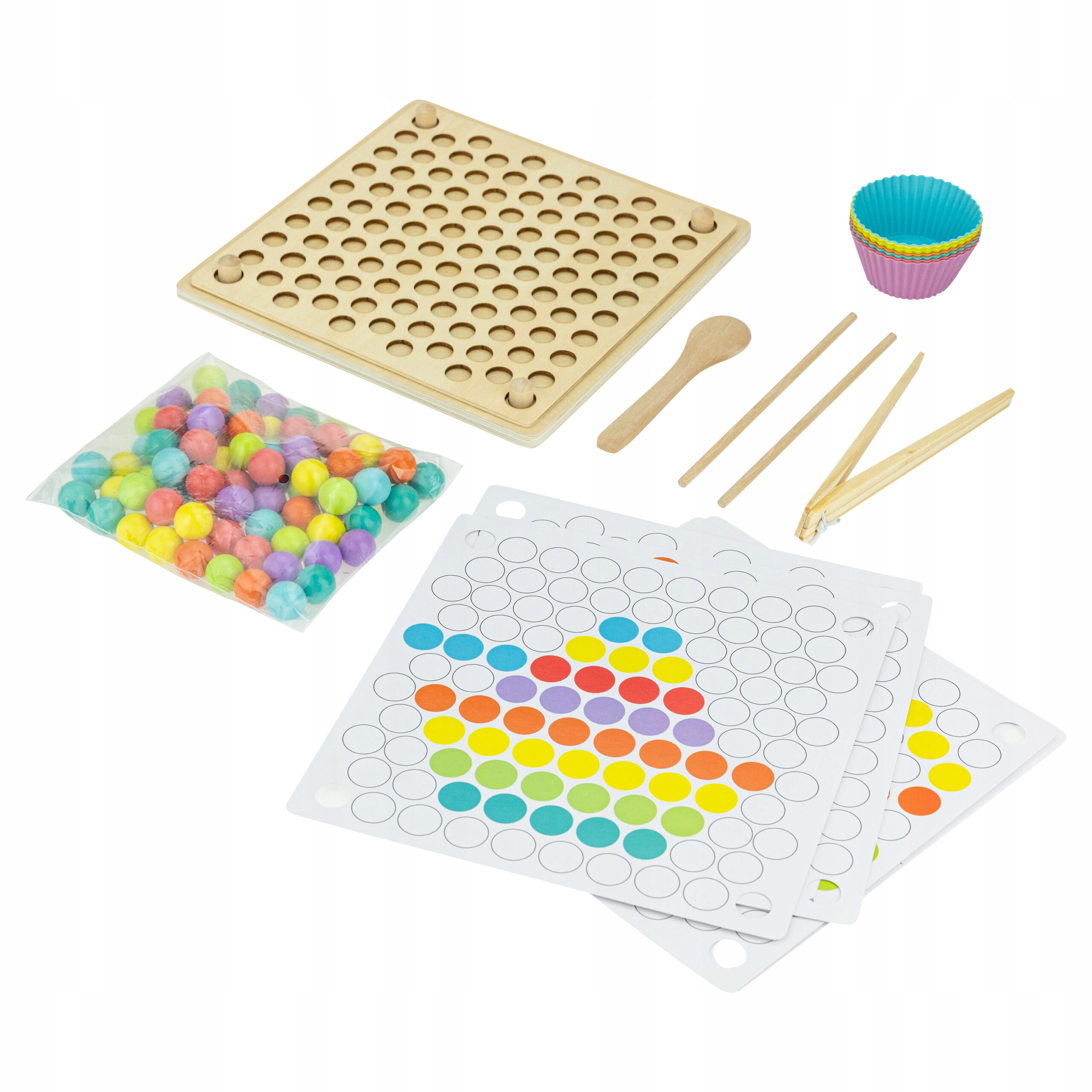 Пазл Монтессорі - це розвиваюча іграшка, яка складається з дерев'яної підставки та дошки, м'ячів та чашок, 5 дощок для шаблонів, щипців, паличок для їжі та ложки. Кульки та форми були розфарбовані 7 яскравими кольорами - жовтим, оранжевим, червоним, фіолетовим, бірюзовим, синім, зеленим. Завдяки цьому вони неодмінно привернуть увагу кожна дитина. Боки та краї набору були ретельно відшліфовані, щоб зробити їх безпечними під час гри.
