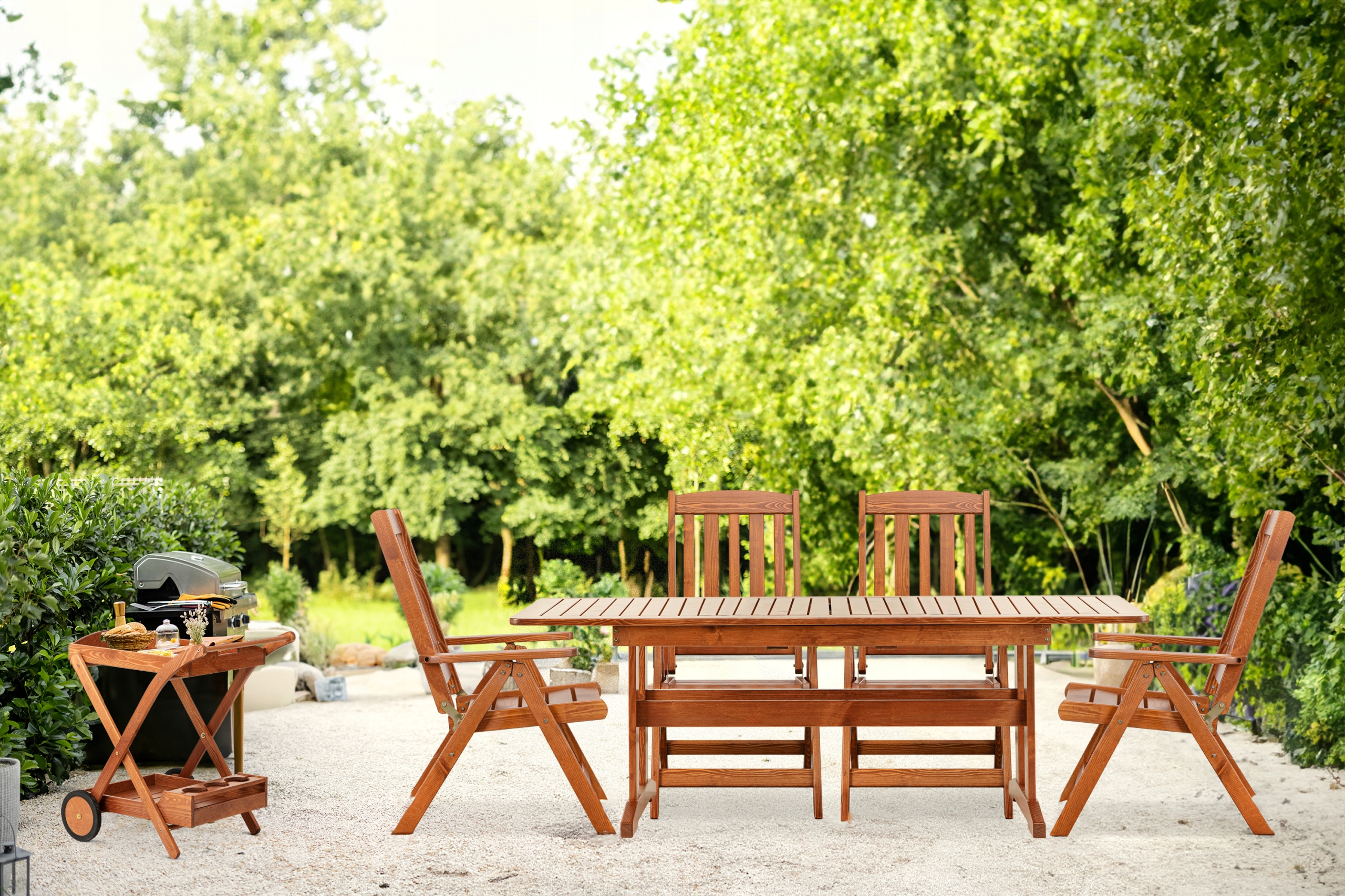 - Стильний дизайн: Садовий стіл відрізняється елегантним природним виглядом. Соснова деревина дає йому чарівність і гармонійно вписується в кожен сад, терасу чи внутрішній дворик.