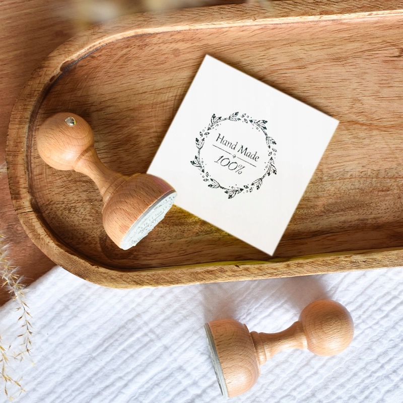 Штамп з дерев'яною ручкою з написом "Hand Made 100%" та графікою. Ідеально підходить для самостійного декорування ярликів і бирок, що зробить виріб ще більш унікальним. Щоб зробити штамп, доторкніться гумовим візерунком, розташованим у нижній частині дерев’яної шийки, до губки, змоченої чорнилом, а потім штампуйте вибраний елемент.