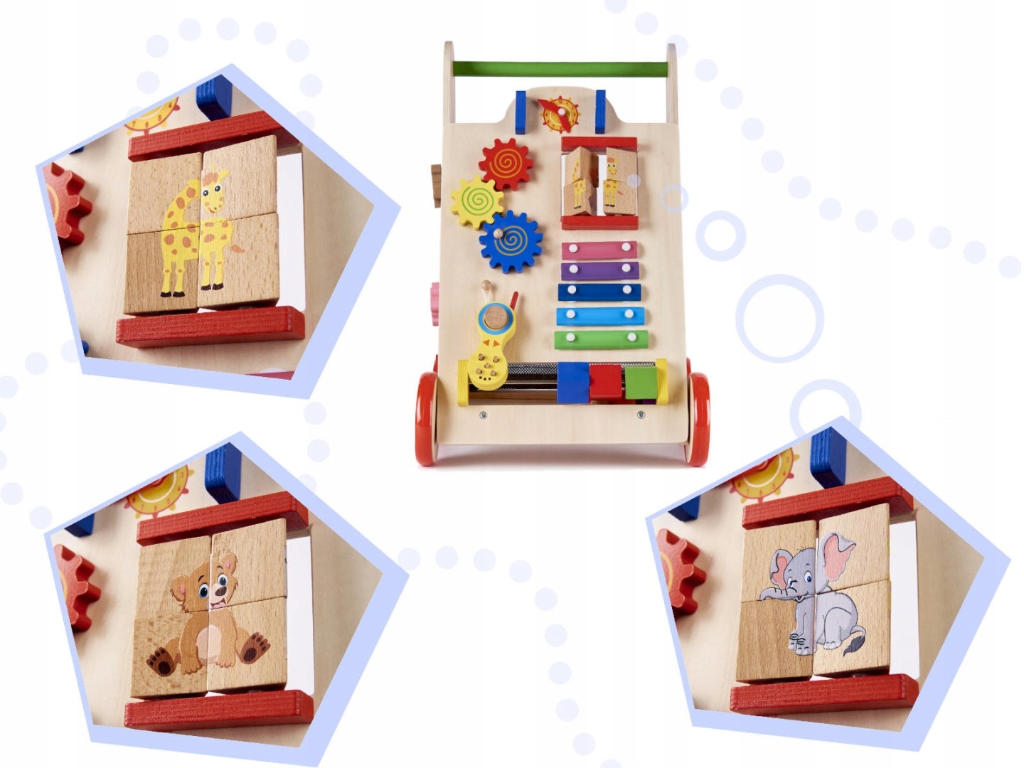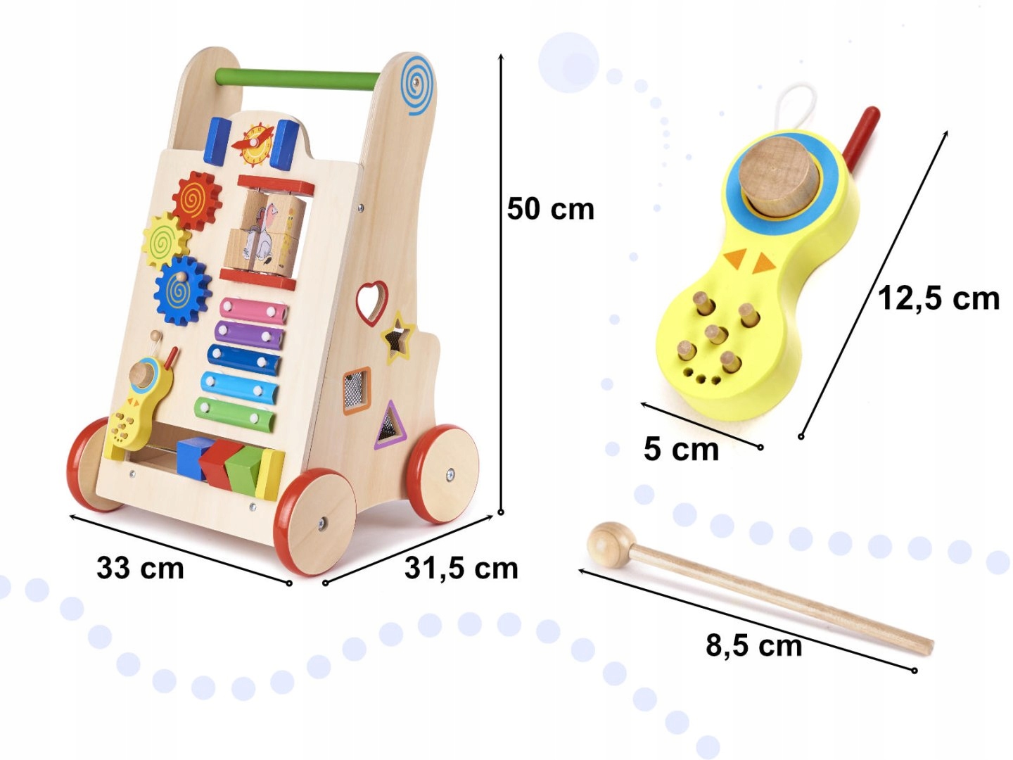 Уокер, який полегшить ваш малюк легше зробити ваші перші кроки. Він також працюватиме в більш пізньому віці як коляска для ваших улюблених іграшок та першого абакуса. Штовхач з штовхачем допомагає малюклу підтримувати баланс під час навчання ходити. підтримує розвиток ручних здібностей та розвиває рухові навички всього тіла. Уокер заохотить малюка до фізичних навантажень. У вас є Walker - це стабільна підтримка для малюка, який вчиться ходити. Дитина не зможе його збити. Дерев’яні колеса були закріплені нешкільним шаром гуми. насолоджується функціональністю і радує око . Естетичний дизайн, виразні кольори, увага до деталей - є приємним та безпечним супутником для вашої дитини. Цей штовхач сподобається батькам, які шукають екологічні аксесуари для свого малюка. дерев'яні іграшки - чудовий вибір!