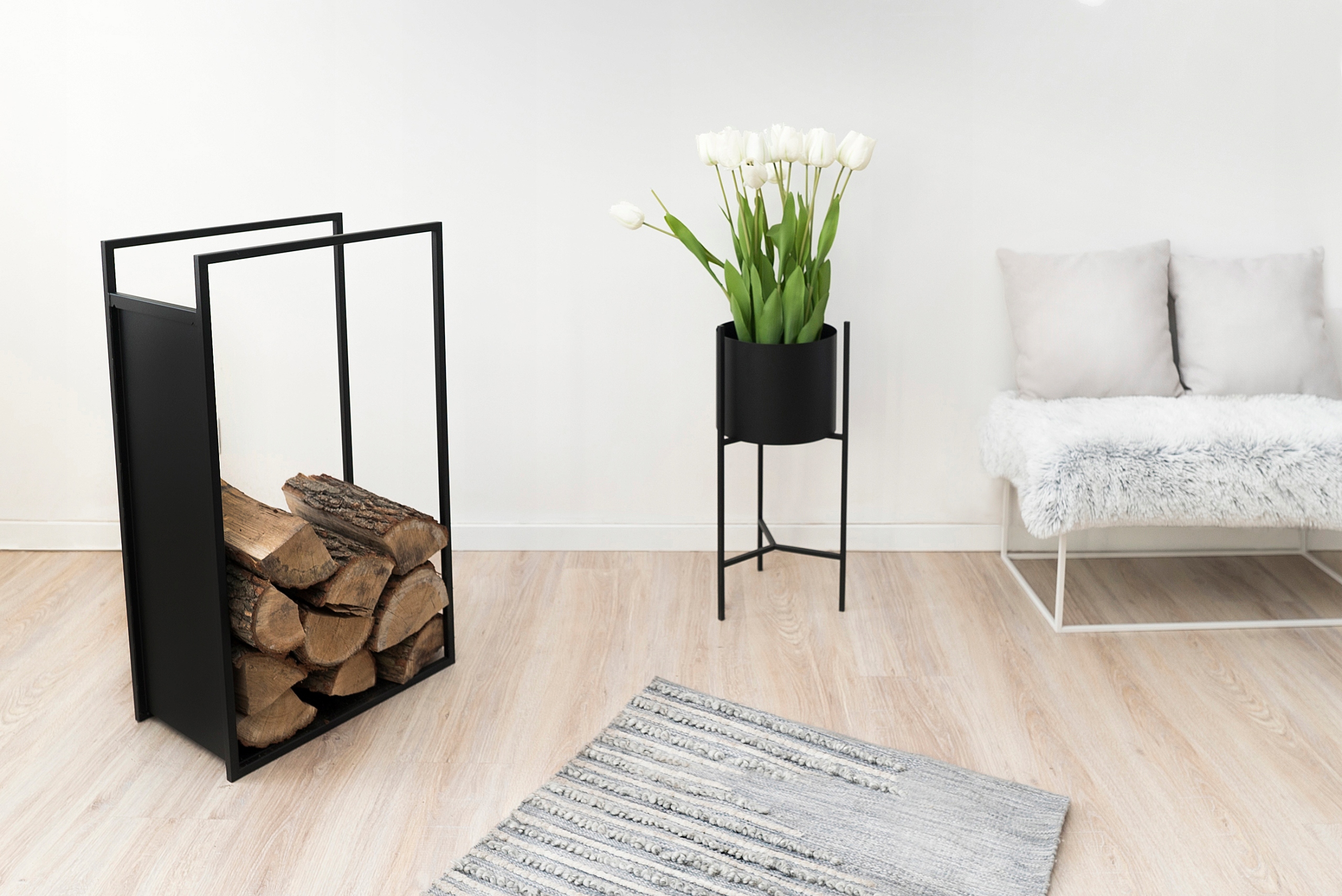 Сучасний стелаж для дров виготовлений саме з високоякісної сталі з порошковим покриттям за сучасними технологіями. Металевий стелаж забезпечує належні умови для сушіння та правильного зберігання дров у камін. Виготовлений із сталевих профілів, він надзвичайно стабільний і довговічний. Вбудована спинка підставки запобігає забрудненню стінки за підставкою, а вбудоване дно запобігає розсипанню деревної стружки під кошик, що підвищує функціональність камінного кошика. Стенд також можна повісити на стіну за допомогою прихованих ручок.