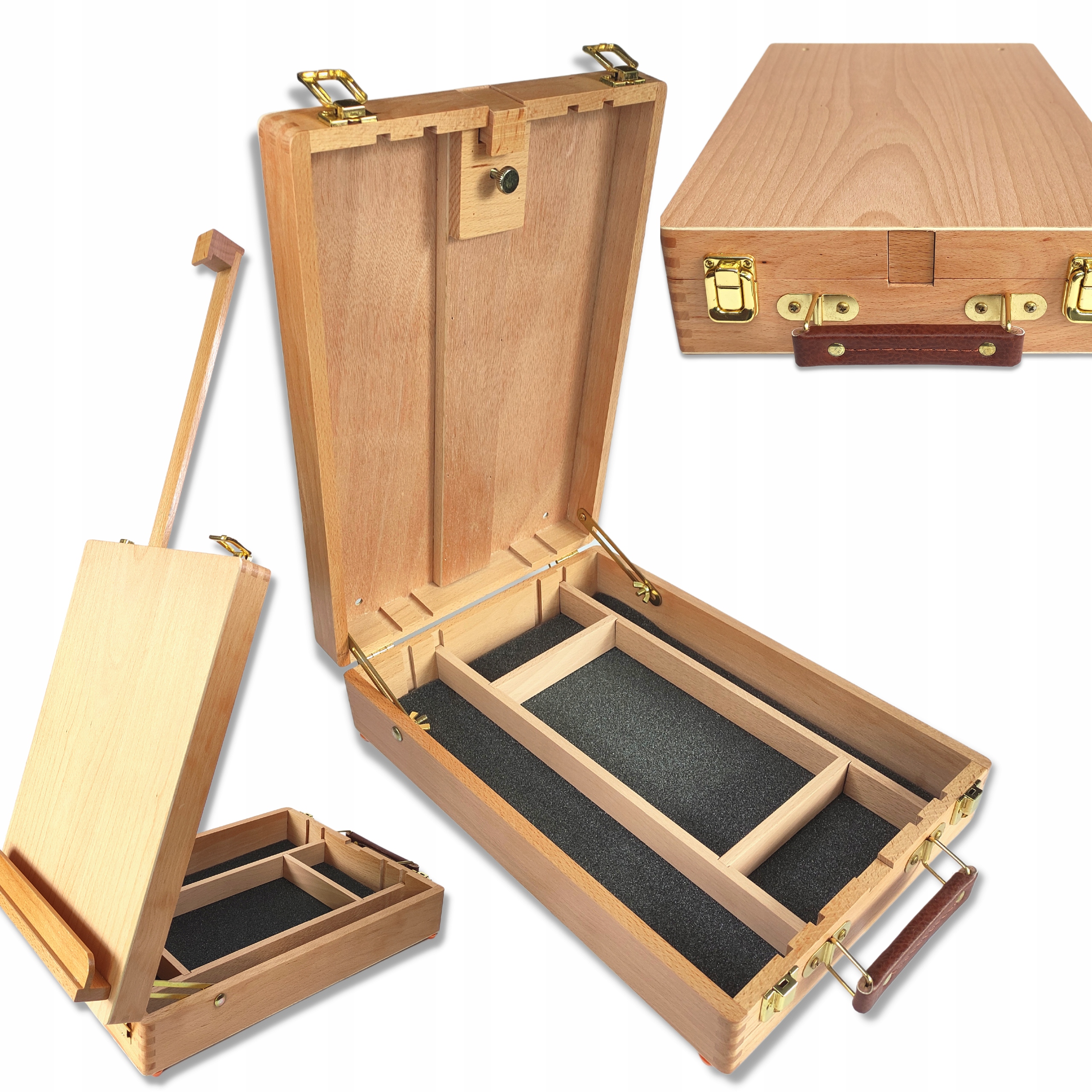 Мольберт У складеному вигляді він перетворюється на елегантну валізу, яку легко транспортувати. Завдяки цьому ви можете виконувати свою роботу будь-де, навіть на відкритому повітрі.