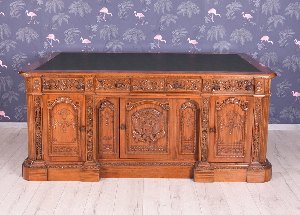 Так званий «партнерський стіл» з масиву червоного дерева, письмова поверхня з високоякісного шкірозамінника.