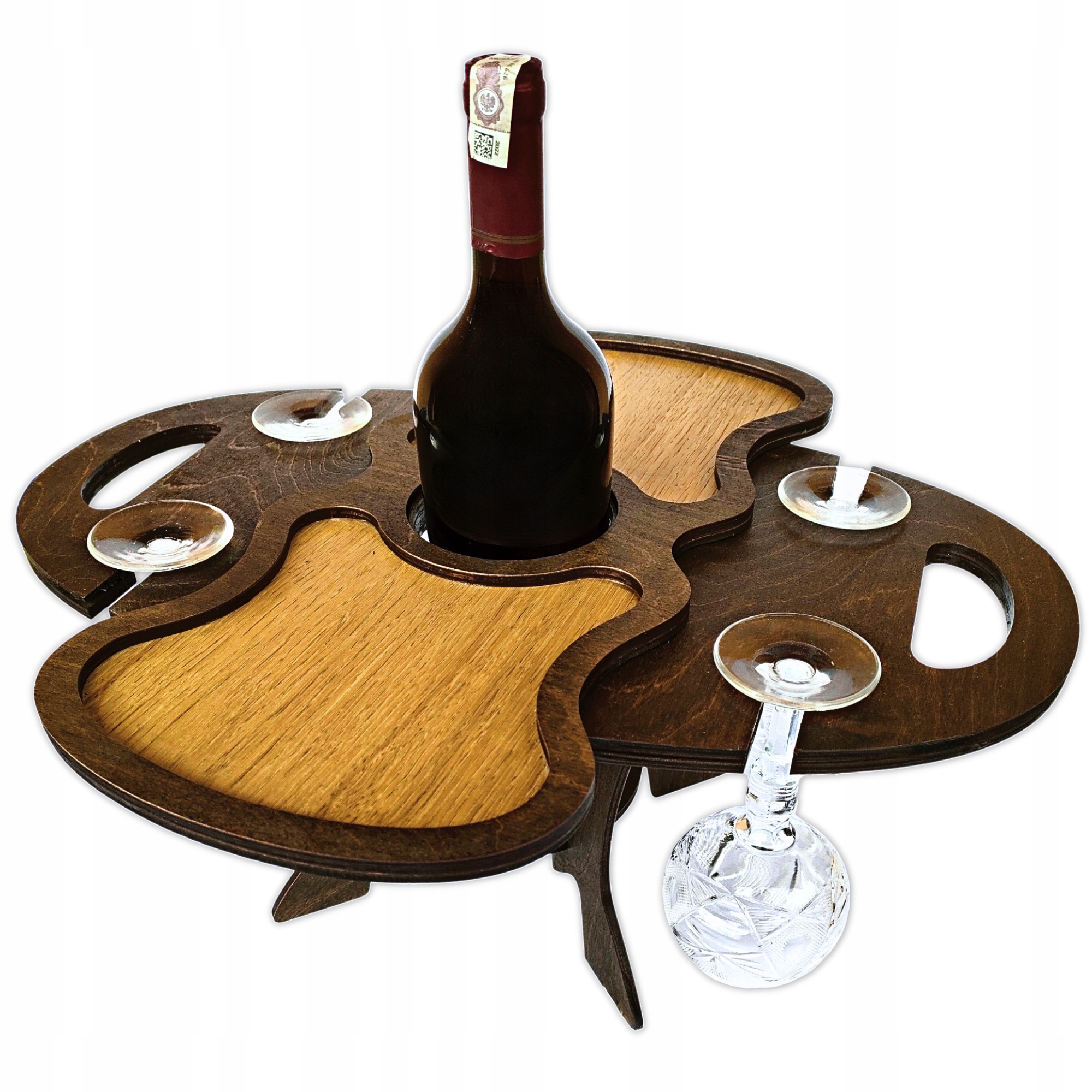 Підставка має спеціальне заглиблення посередині, куди надійно розміщується пляшка. З боків підставки є отвори, в які вставляються фужери. Таке розташування дозволяє зручно подавати вино та гарантує безпечне та стійке розміщення пляшки та келихів.