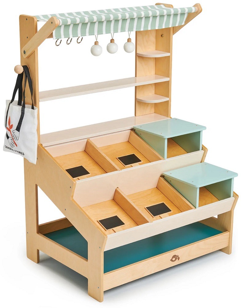 Крейдяні дошки дозволяють записувати назви та ціни товарів, а тканинний дах захистить товари від сонця.