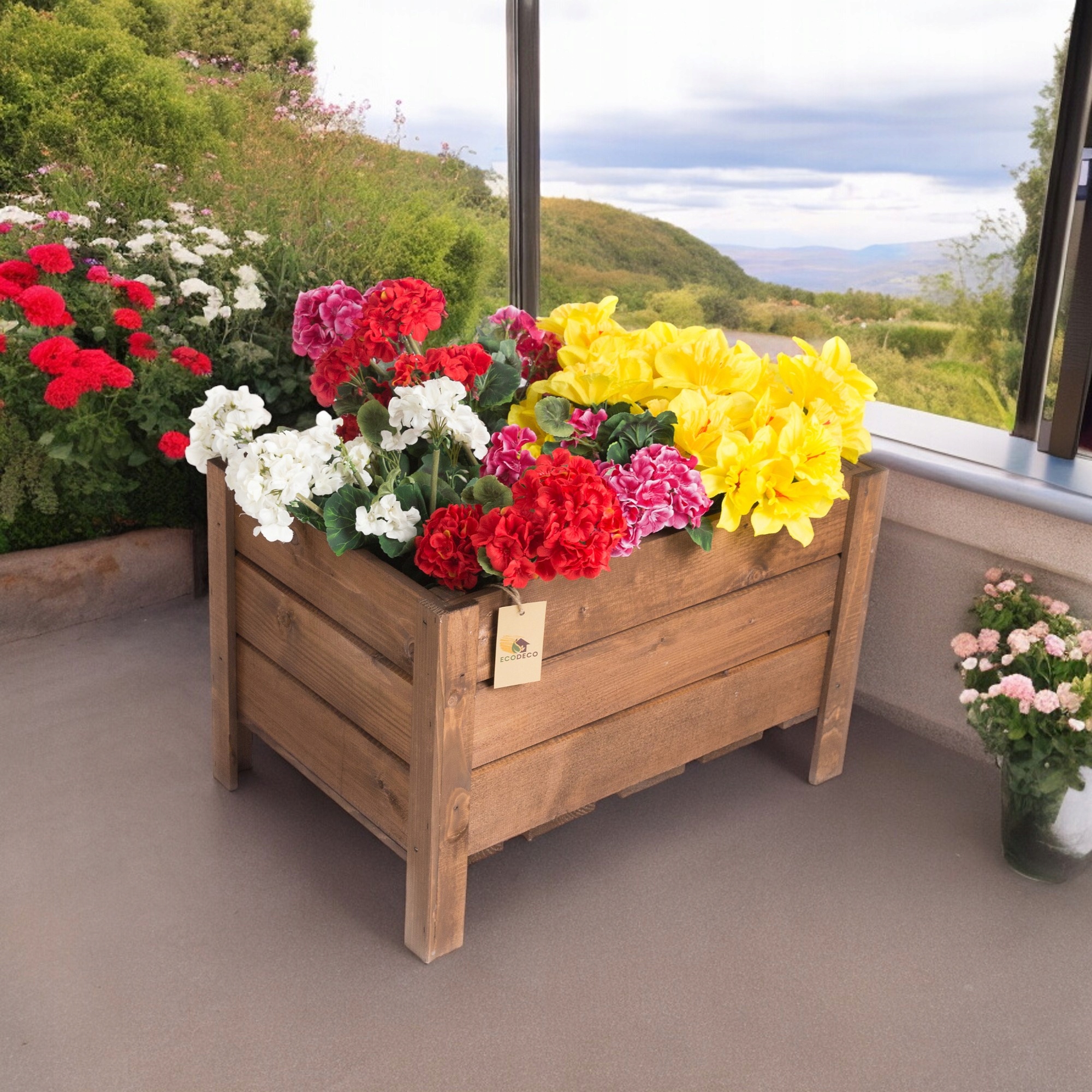 Ящик покрито просоченою фарбою, яка захищає деревину від погодних умов, забезпечуючи її довгостроковий захист і збереження його природного шарму протягом багатьох сезонів.