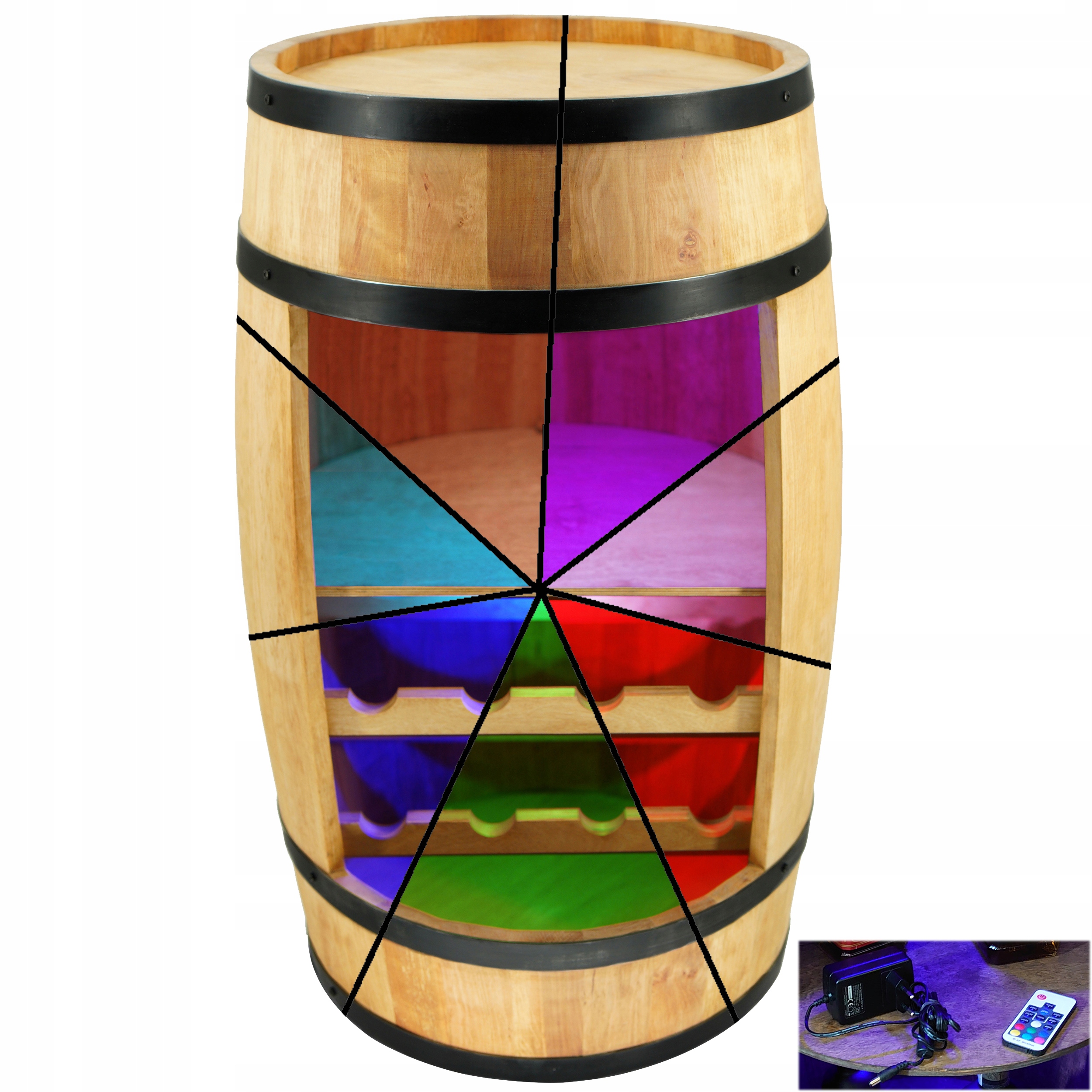 Підсвічування, встановлена в бочці, працює від живлення 230/12 В. завдяки бездротовому пульту дистанційного керування та використанню світлодіодних світильників RGB можна віддалено керувати рівнем яскравості, і кольором підсвічування. Дистанційне управління містить 7 кольорів, які можна вибрати з , автоматичних режимів переходу від одного кольору до наступного та здатність змінювати інтенсивність світла . Завдяки освітленню ми можемо заглянути в куточки та вибрати ідеальний напій для даного випадку.