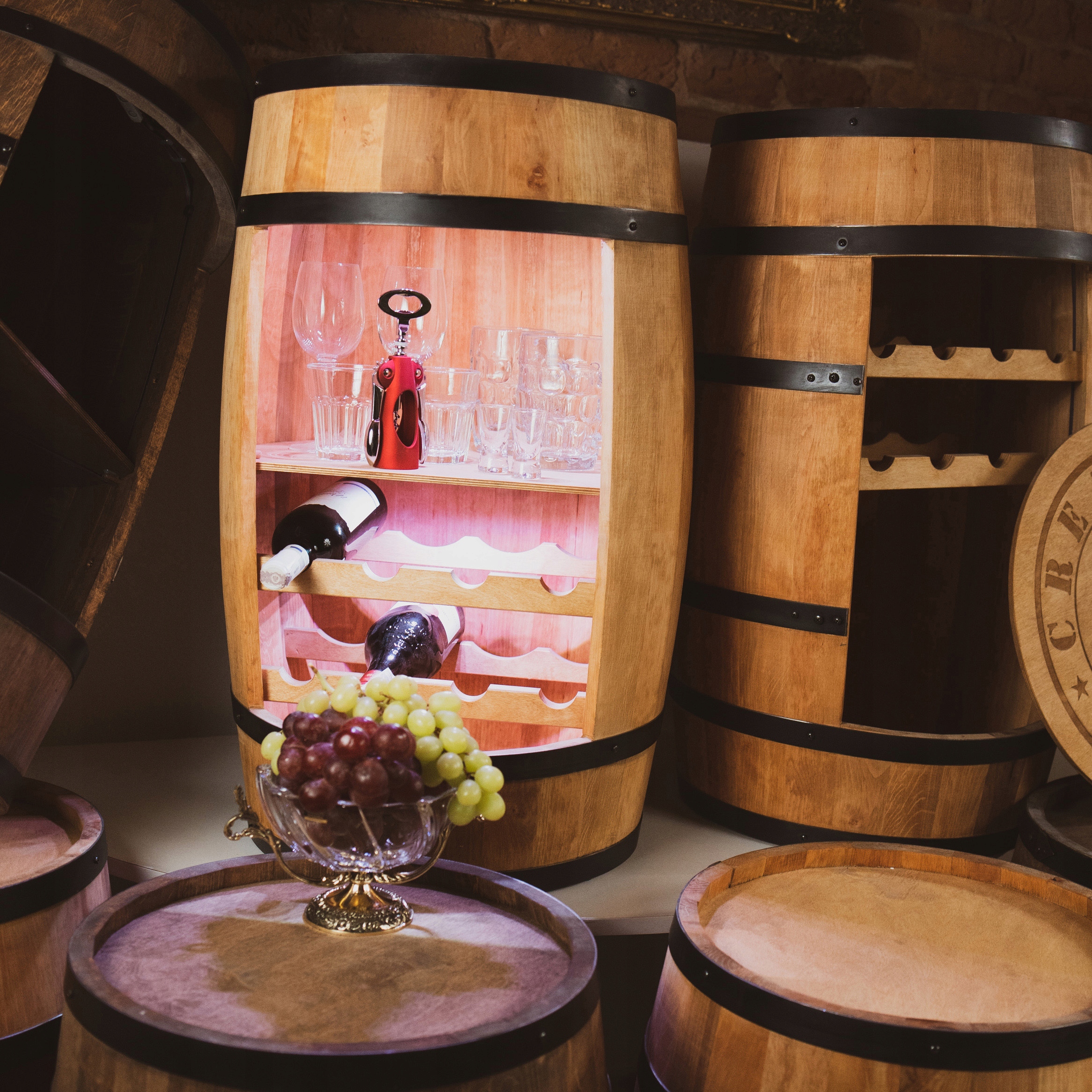 Барель - Бар з винною полицею - це унікальний предмет меблів, який забезпечує унікальну внутрішню прикрасу в поєднанні з практичним використанням. Кожна бочка виготовлена вручну , починаючи з ріжучих дощок у пилорамі, закінчуючи ручкою платних платежів, що надає бочку унікальну опуклу форму. У планці розміщено близько 30 пляшок (залежно від форми та розміру).