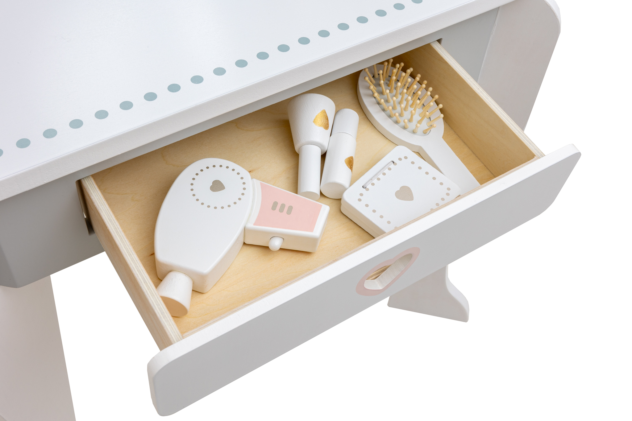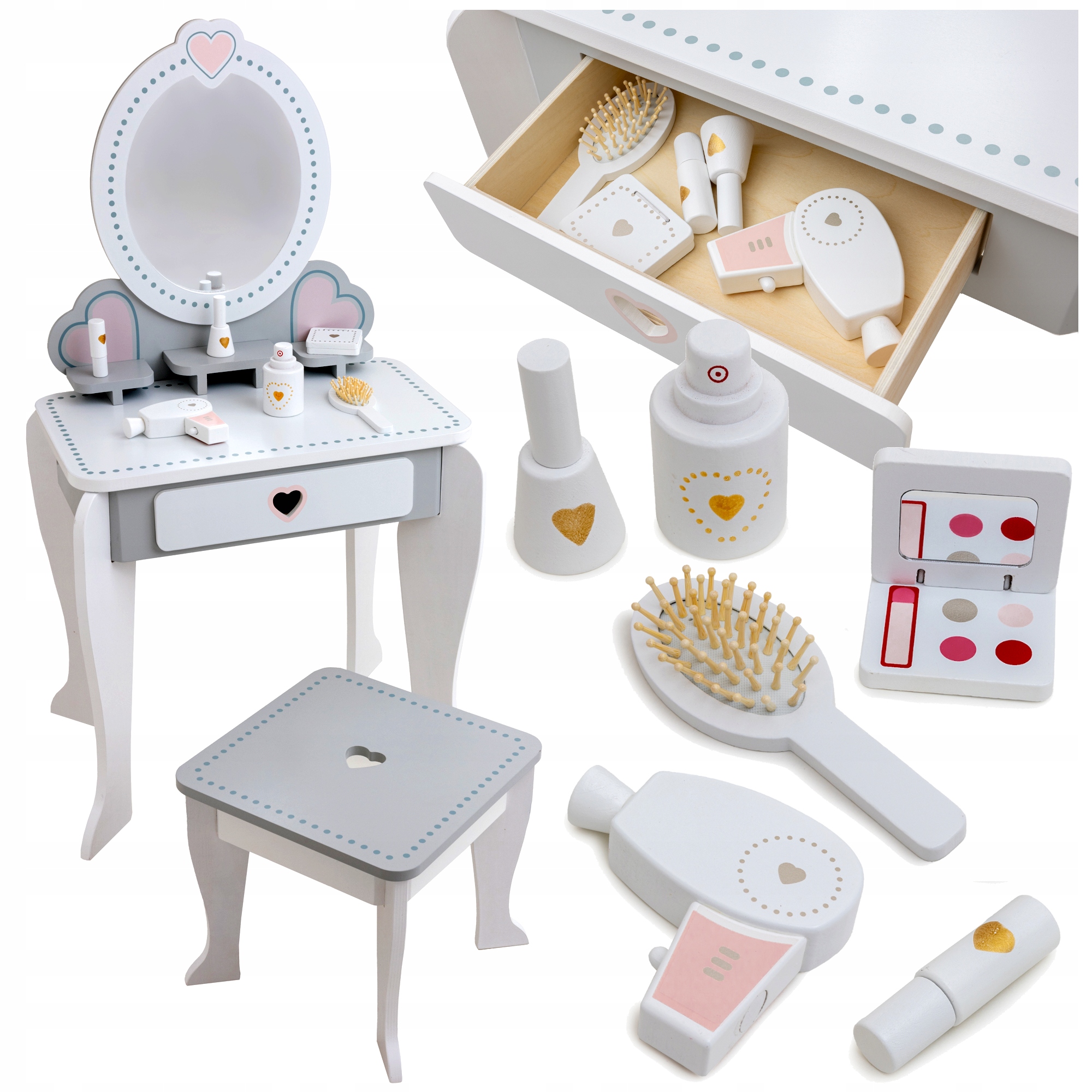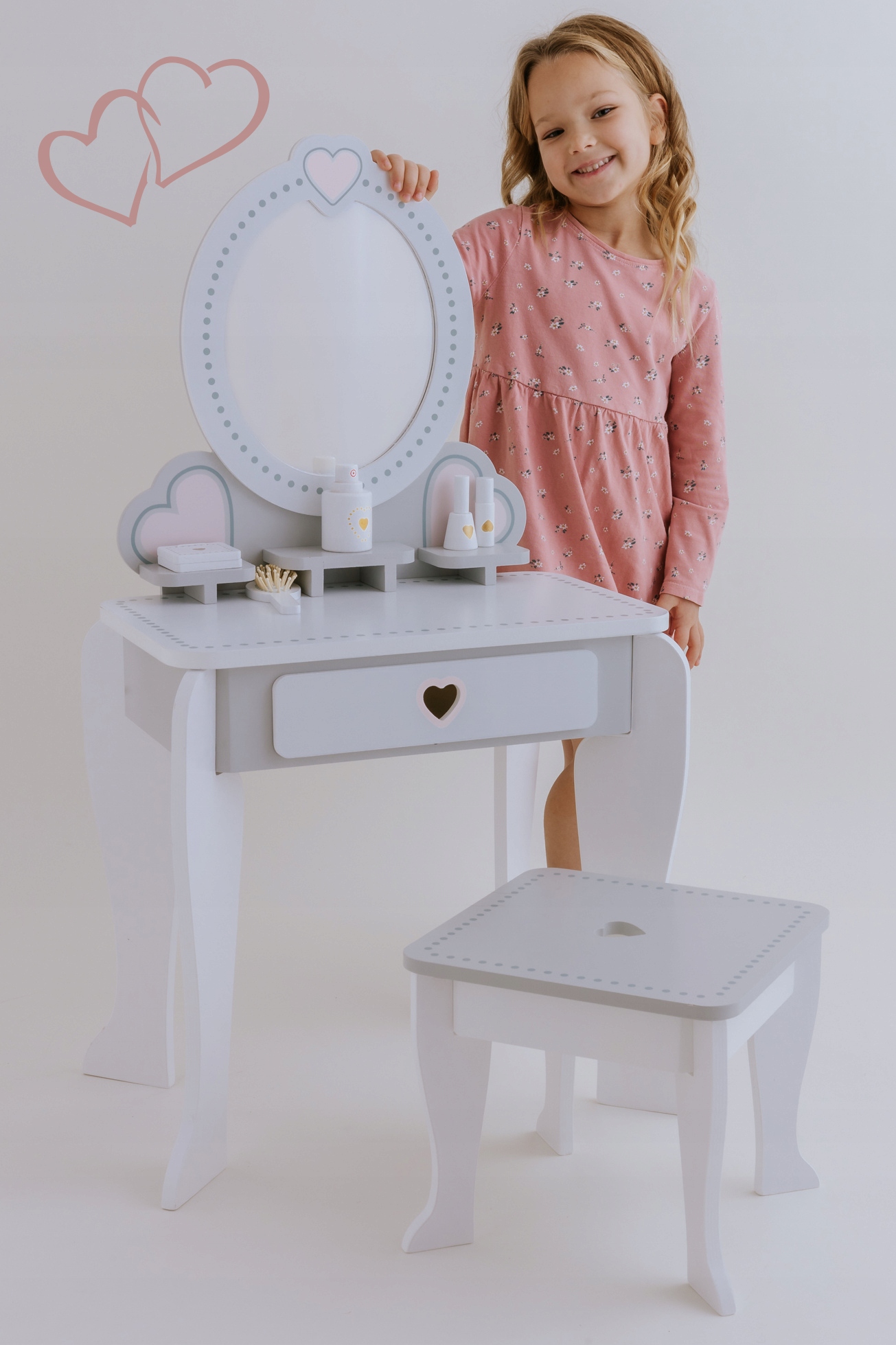 Унікальний дерев'яний туалетний стіл для дівчини в красиві пастельні кольори білого, сірого та рожевого . > Туалет радує його дизайн - Великий, функціональний верх забезпечує багато місця для всіх необхідних аксесуарів, а дзеркало з чітким відображенням Дозволяє милуватися вільно під час гри.