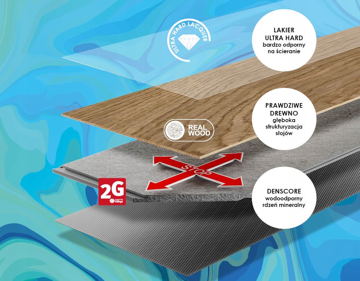 *Водонепроникність підлоги означає, що продукт нечутливий до тимчасового впливу води. Детальну інформацію можна знайти в Інструкції з монтажу, Гарантійному талоні та документі Умови використання лакованої підлоги Next Step.
