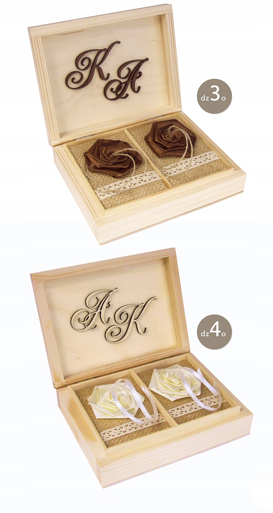 3D-ініціали всередині, на джутових подушках, прикрашених мереживом, сердечками або трояндами з бантом для кріплення обручок.