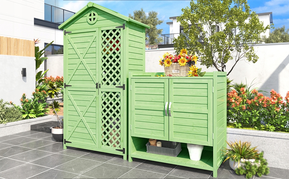 - Назва продукту: дерев’яна садова шафа, набір садових шаф, зовнішня шафа, шафа для інструментів, шафа для інструментів, балконна шафа, шафа для інструментів, включає одну велику та дві маленькі шафи для садових інструментів, садові меблі, зелений