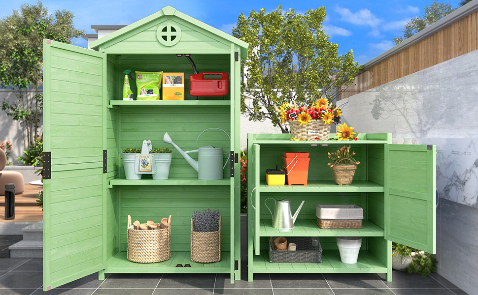⏩Багатофункціональний дизайн: шафа Шафа для інструментів створена для забезпечення гнучкого простору для зберігання та покращена вентиляція, що дозволяє легко зберігати та швидко отримувати доступ до садових інструментів, щоб залишатися організованими.