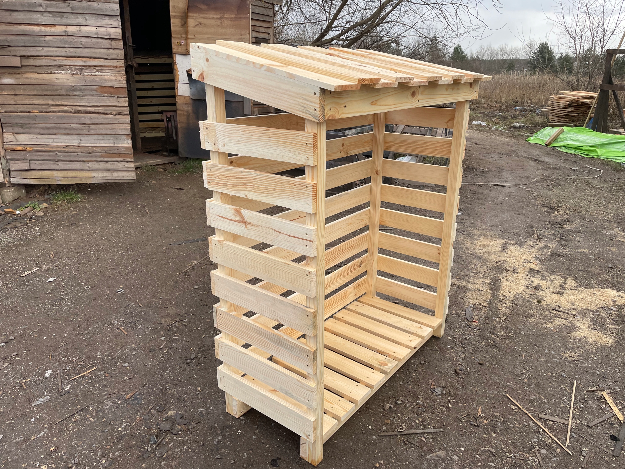 Структура виготовлена з крана 5х4, підлоги та настінної дошки з гр. 21 мм. Дах з нахилом вперед (ви можете зробити спину вниз)