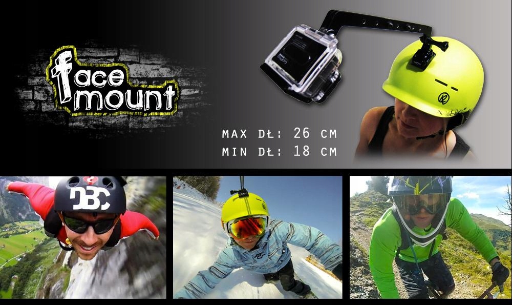 Подовжувач дозволяє кріпити камеру GoPro на шолом, як і налобний ліхтар. Тримач FaceMount виготовлений зі скловолокна, що забезпечує дуже малу вагу та неймовірну міцність. Завдяки цій рамі камеру можна розмістити на самій собі.