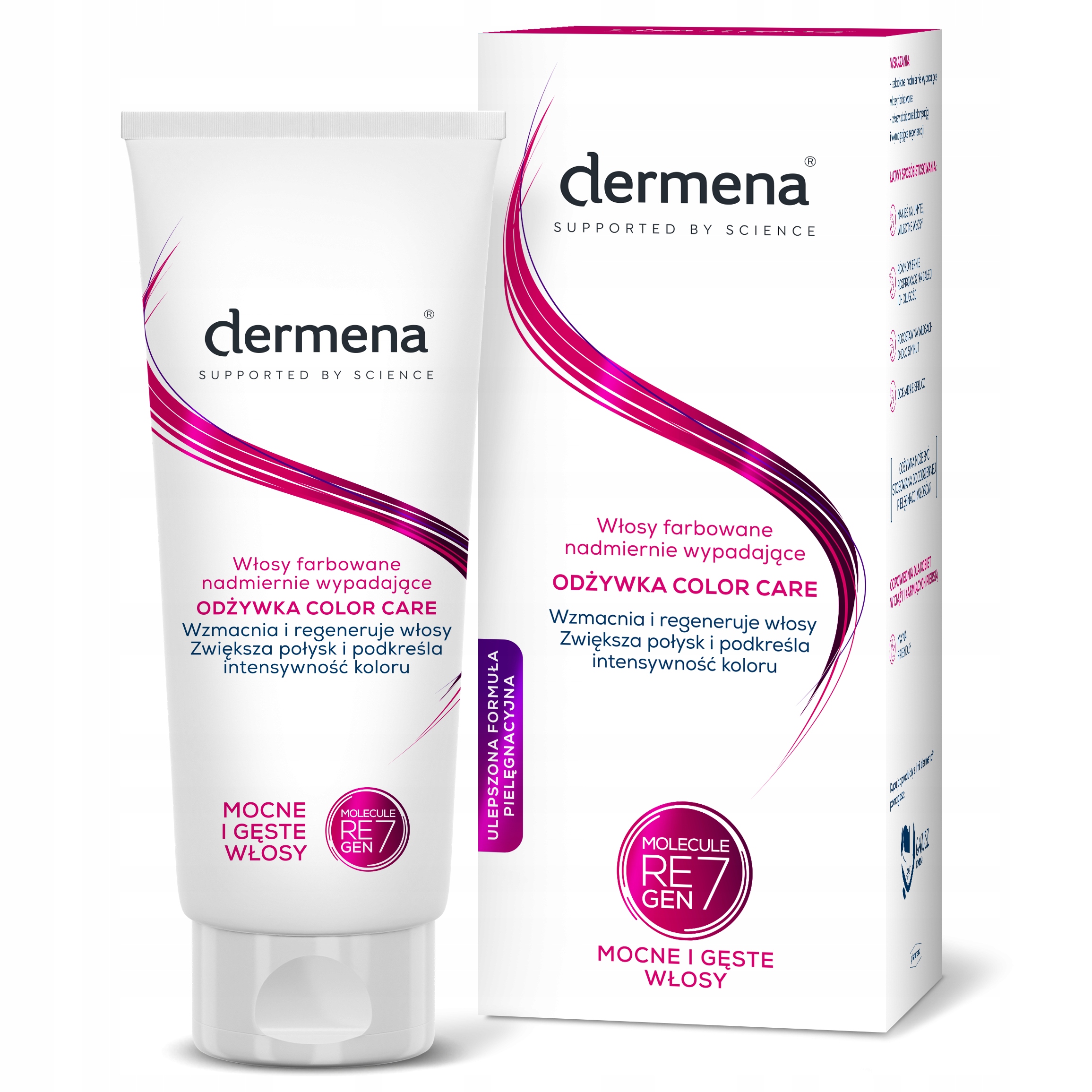 dermena® color care - засіб для догляду за волоссям у поганому стані: пошкодженим частим фарбуванням і з проблемою надмірного випадання. Містить запатентовану діючу речовину вітамінного походження (молекула Regen7). Спеціально підібрані поживні речовини зміцнюють волосся та відновлюють його кератинову структуру. Кондиціонер покращує загальний вигляд пошкодженого фарбою волосся. Полегшує розчісування і не обтяжує волосся. Після використання волосся стає м’яким, відновлює свою життєву силу та еластичність.