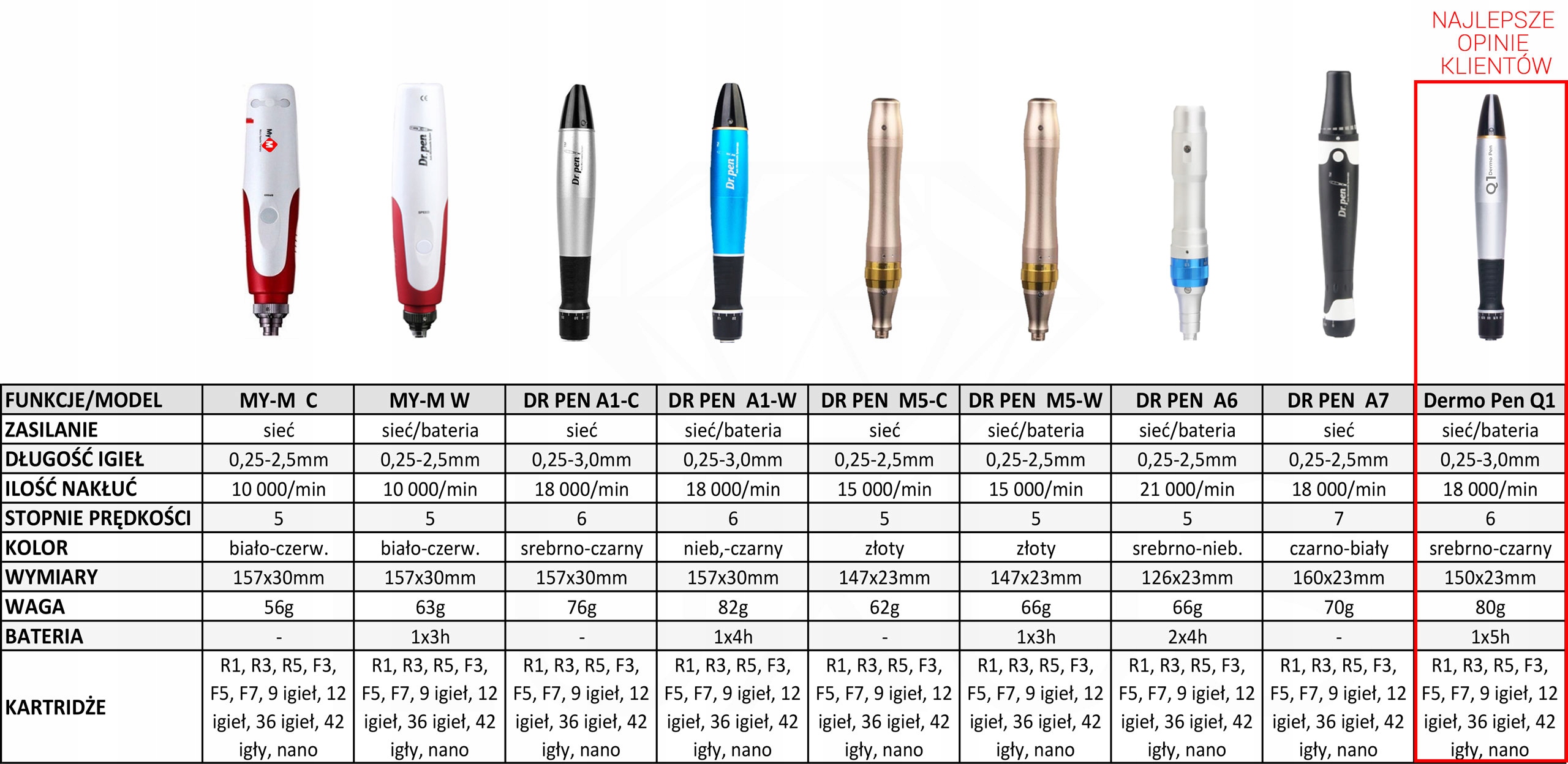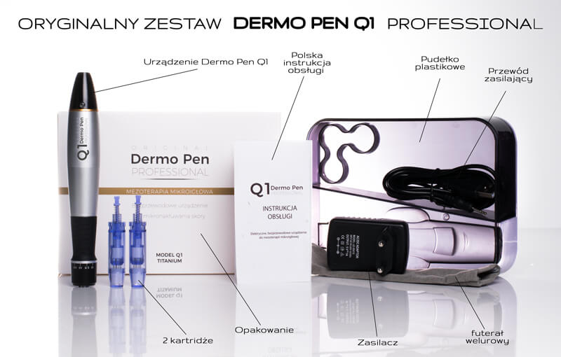 В основі пристрою лежать змінні картриджі, оснащені голками з молібдену - найсучаснішого матеріалу, який використовується для виробництва хірургічних інструментів. Голки можна використовувати людям з алергією на метали, оскільки вони не містять хрому та нікелю. Завдяки використанню молібдену голки в апараті DERMO PEN Q1 надзвичайно тонкі та міцні, що значно підвищує комфорт під час лікування.