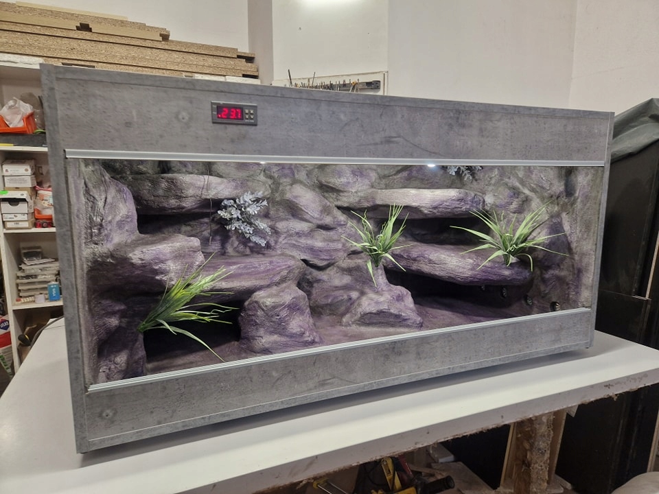 На фотографіях показано тераріуми, які ми зробили за індивідуальним порядком і можуть бути моделлю для подальших робіт. Терарія, замовлена вами, не буде копією, як представлені нижче - але вони можуть бути подібними. Ми будуємо кожен танк з нуля. Покупець має можливість вибору скельної системи (наскільки це можливо) та фонового кольору тераріуму.