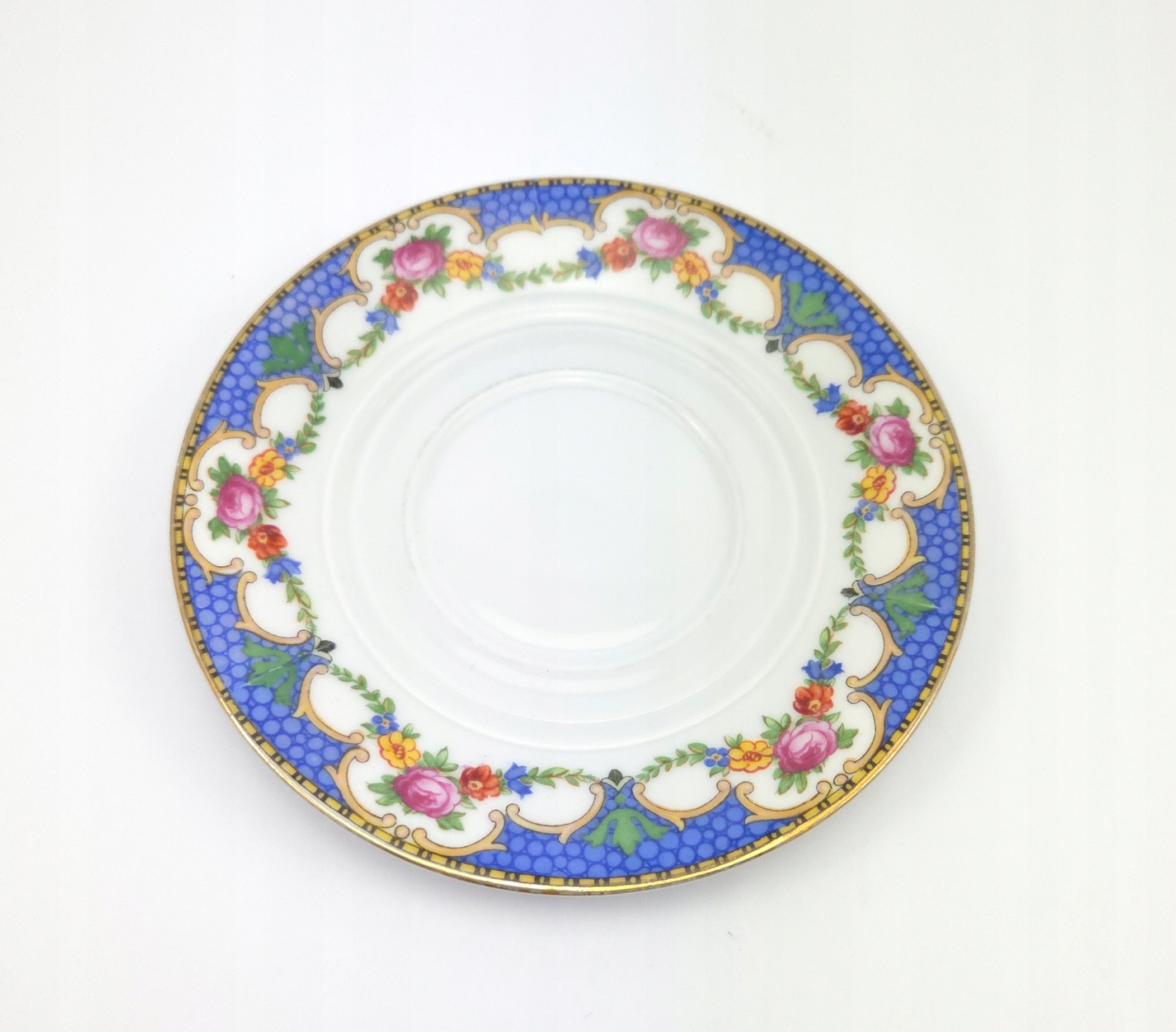 Порцелянова десертна тарілка, блюдце, прикрашена квітковим мотивом та позолотою.