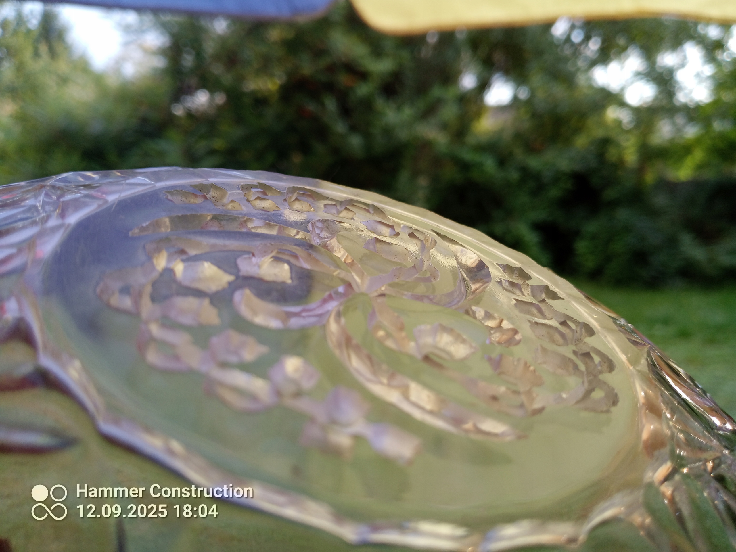 десертні тарілки (6 штук) з великою тарілкою для подачі тортів або десертів - набору, що складається з 7 штук, вироблених у HSG Ząbkowice у 1930 -х роках. Номер моделі в Huta 1281 пропонує каталог для всього діапазону в цій схемі. Натисне, прозоре скло, прикрашене флористичним рельєфом у дзеркалі, щоб підкреслити його пластичність, оснащене килимком.