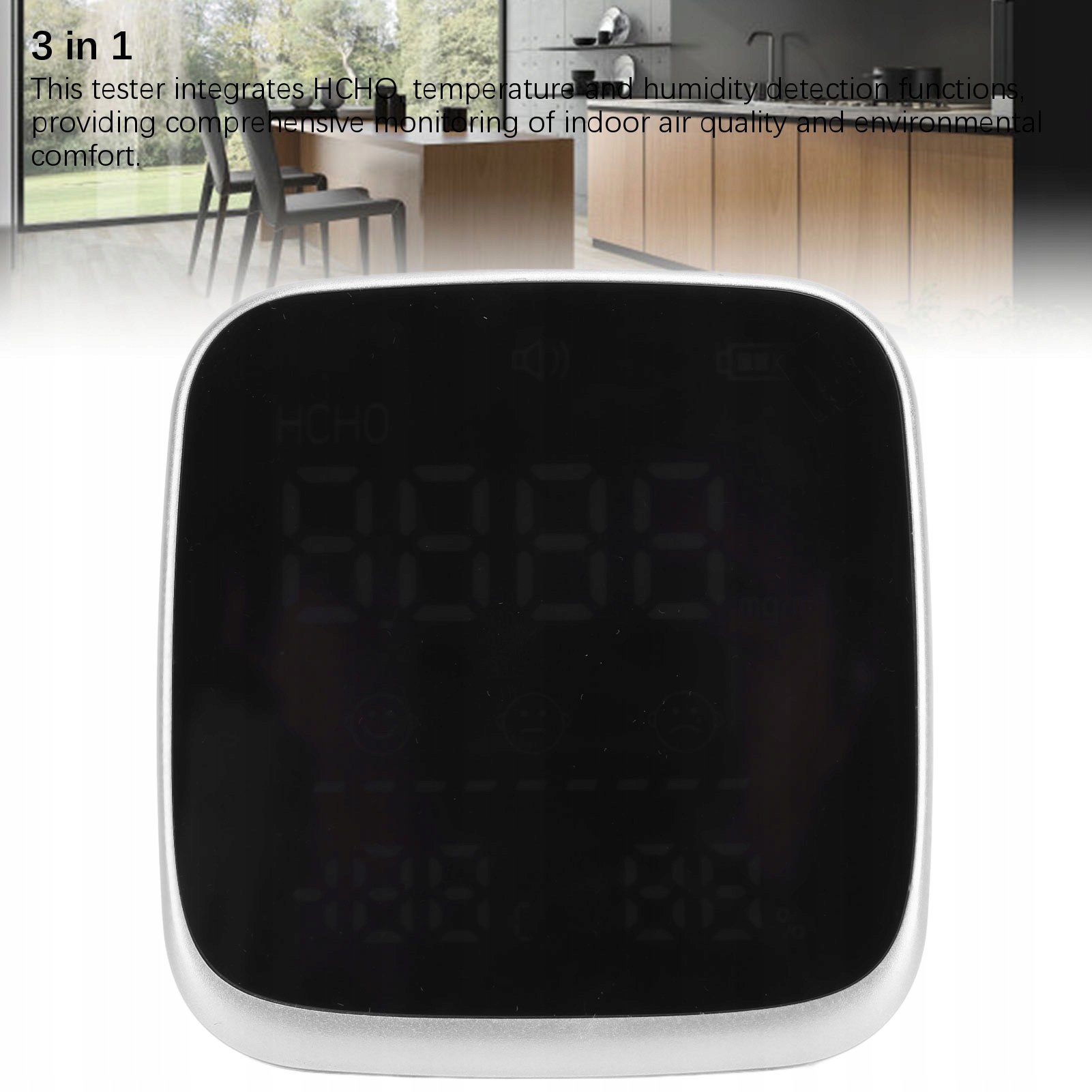 1. 3 в 1: Цей тестер інтегрує функції HCHO, температуру та вологість, забезпечуючи комплексний моніторинг якості повітря в кімнатах та комфорті навколишнього середовища.