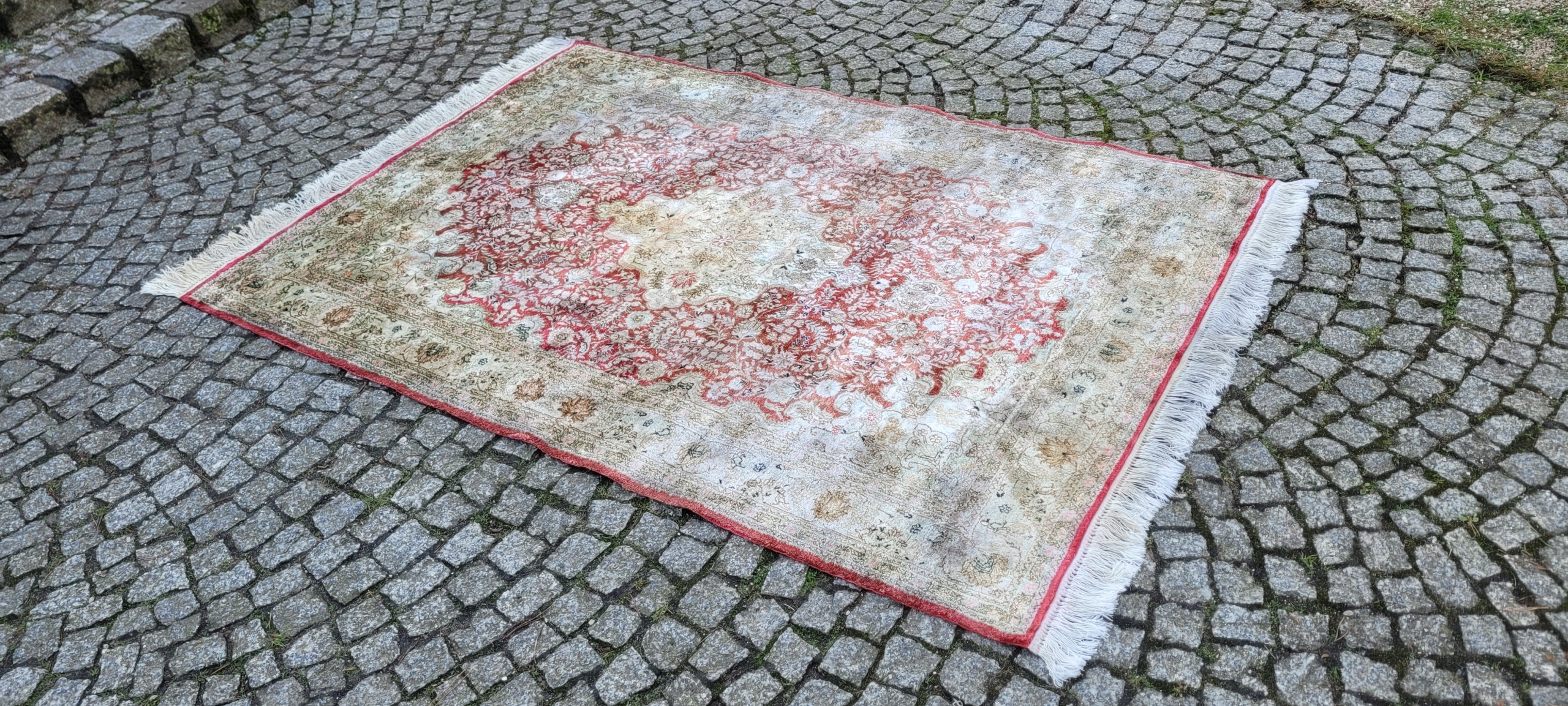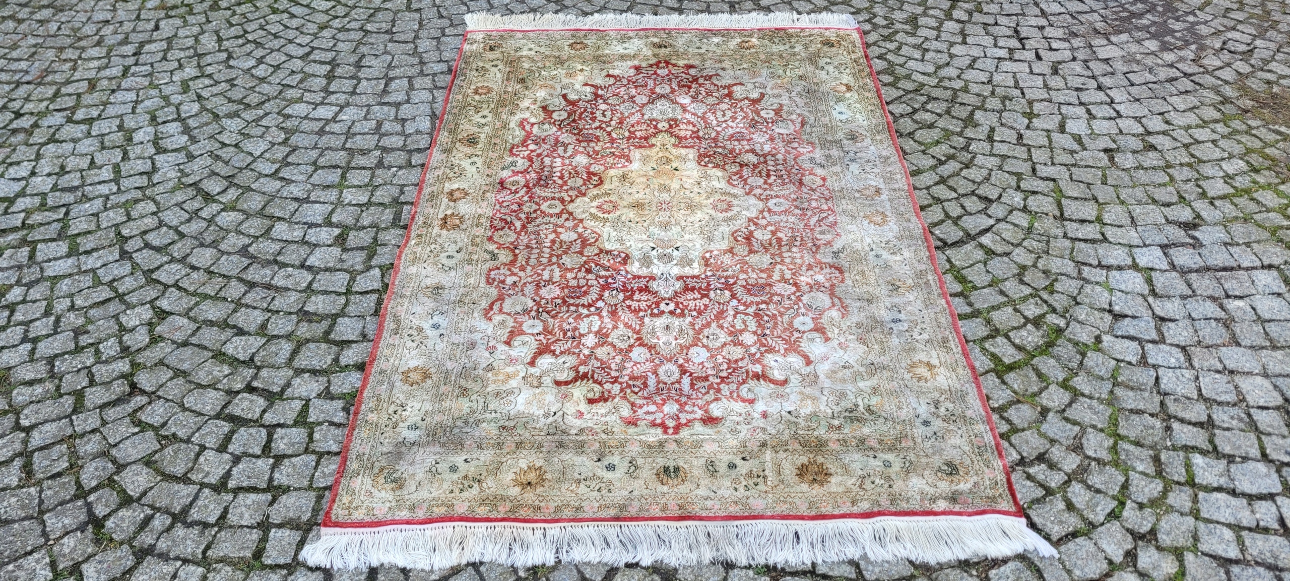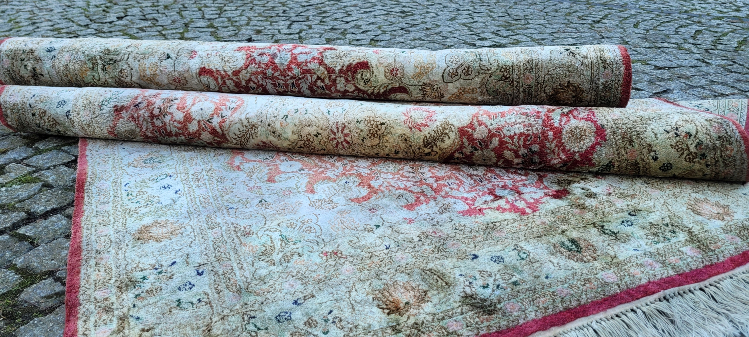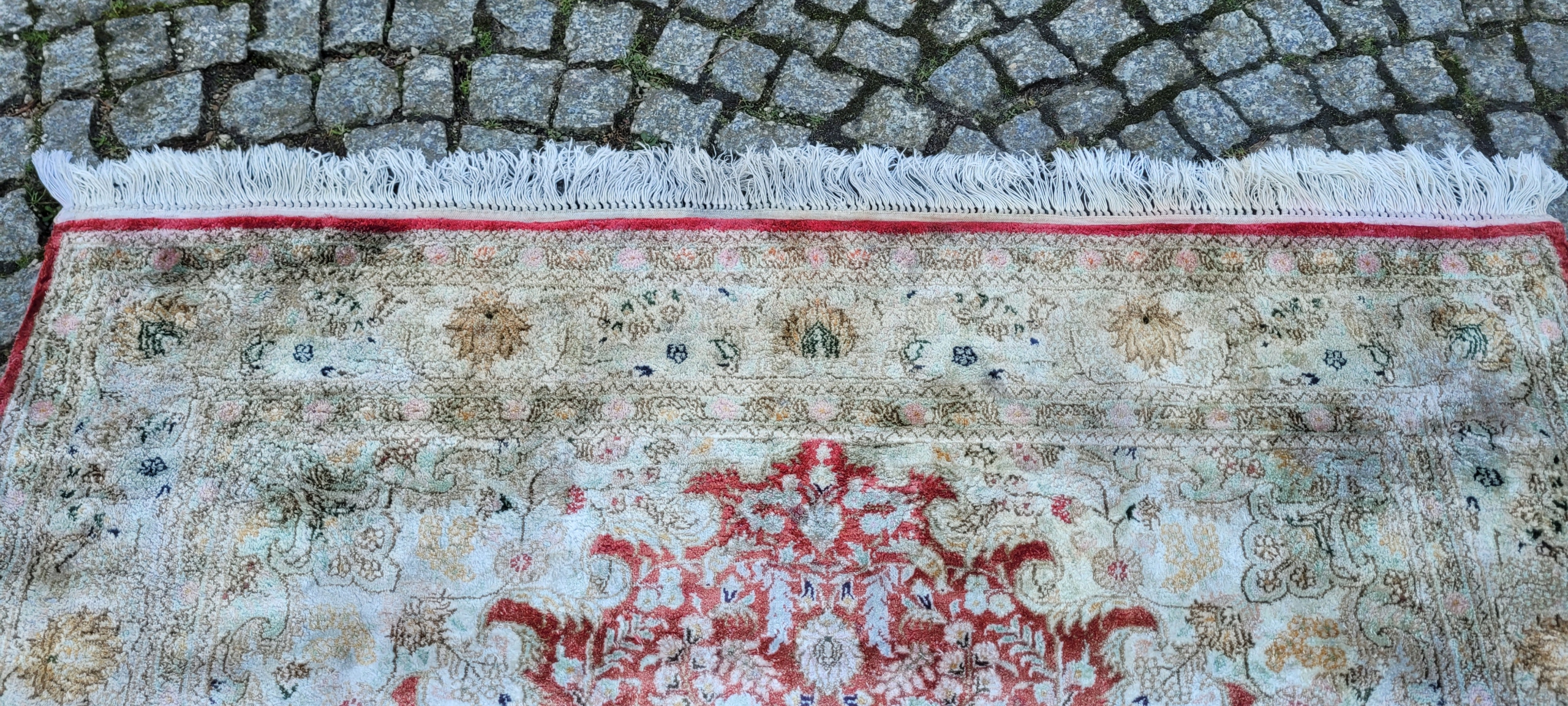 Індійський килим Ghom. Виготовлені вручну з вовни та шовку. Характеризується компактним, приємним на дотик, блискучим флісом і красивими кольорами та візерунками. Він у дуже хорошому стані, мінус видно на фотографіях.