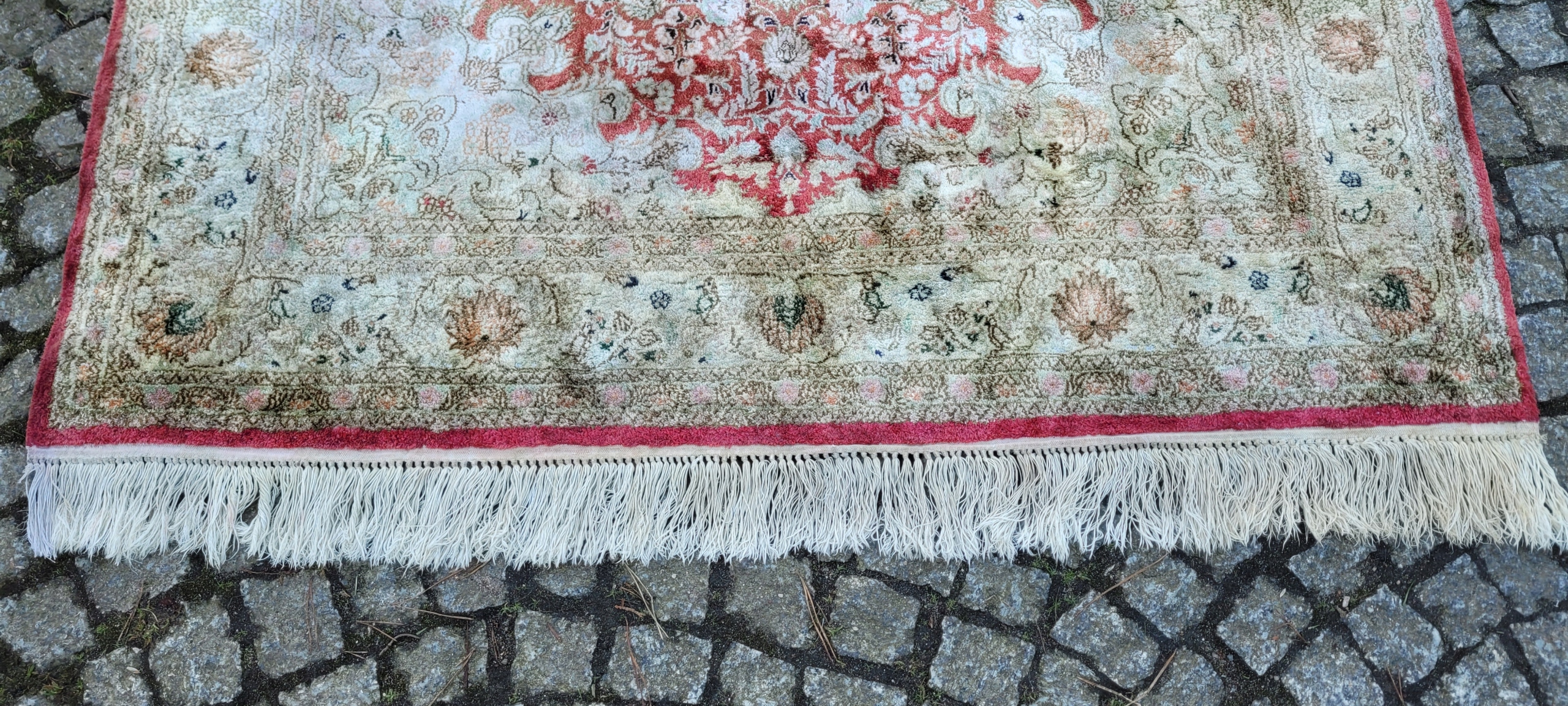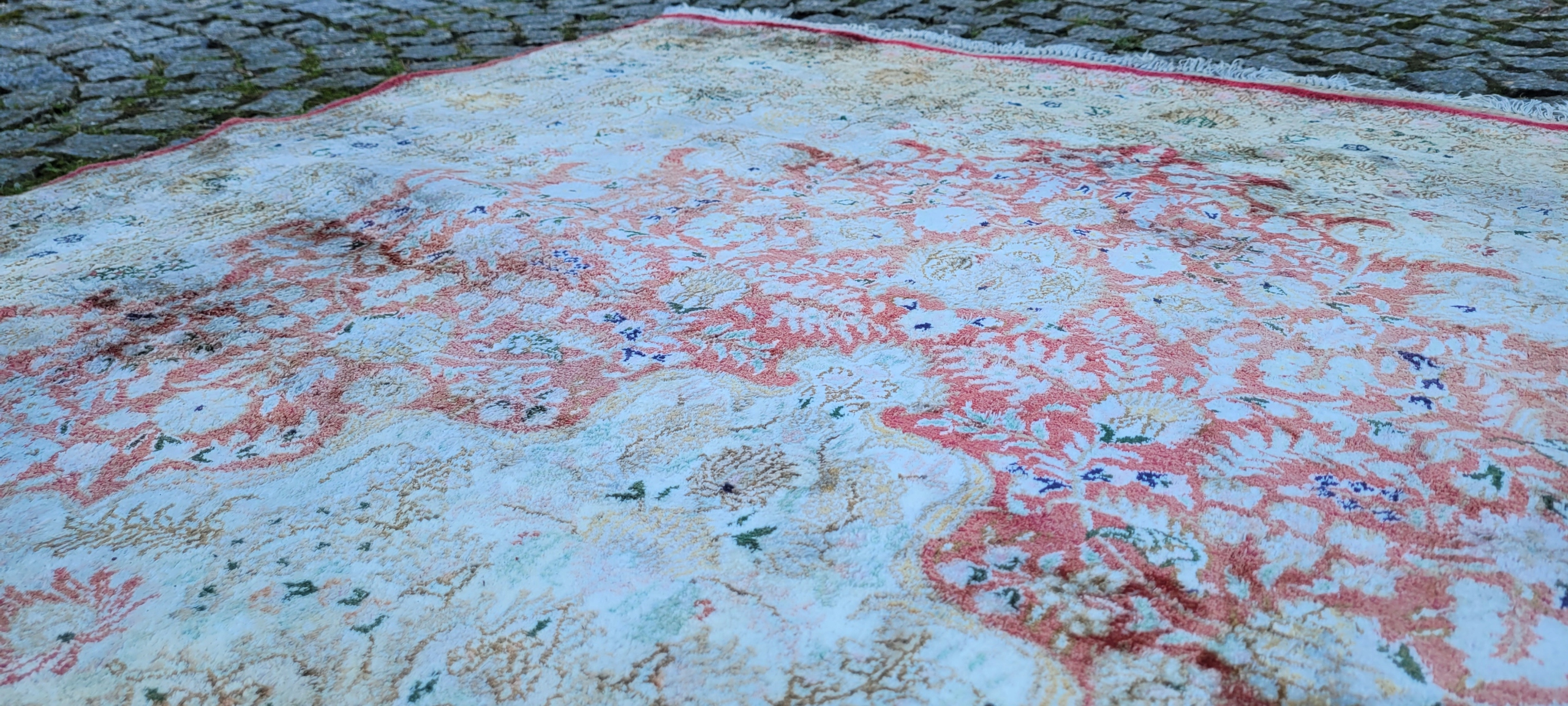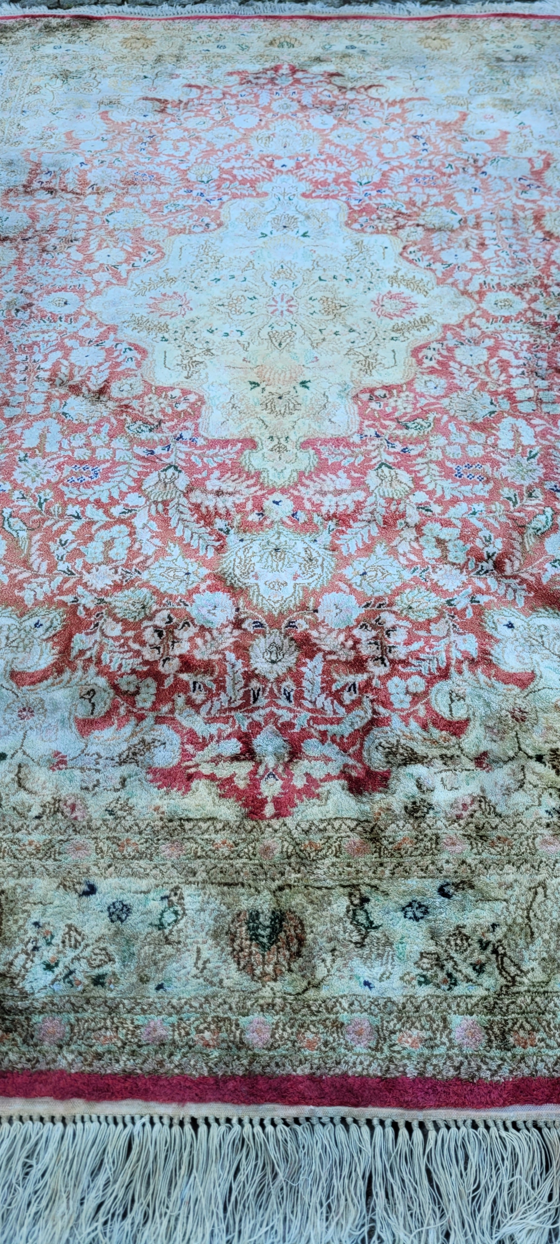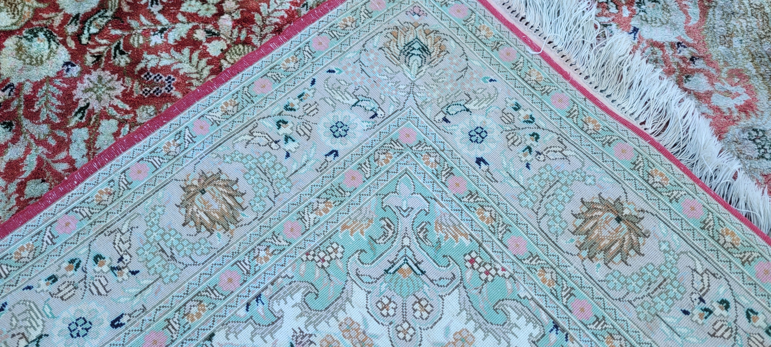 Індійський килим Ghom. Виготовлені вручну з вовни та шовку. Характеризується компактним, приємним на дотик, блискучим флісом і красивими кольорами та візерунками. Він у дуже хорошому стані, мінус видно на фотографіях.