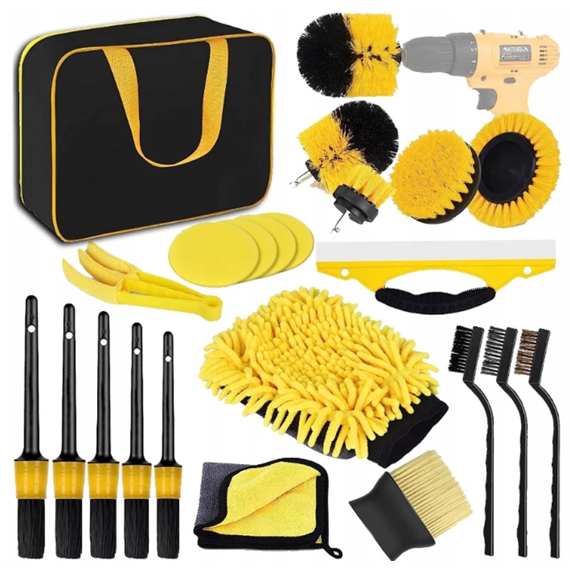 вміст (1 × великої сумки - 1 ×. precision brush (diameter 14 cm) - 1 × Detailing brush - 1 × Detailing brush (diameter 10 cm) - 1 × Small precision brush (diameter 4.5 cm) - 1 × microfiber mop glove - 2 × sponge (diameter 9.5 cm) - 1 × brush for air vents ventilation - 1 × windshield welt - 1 × microfiber towel (30 × 30 cm) - Роздрібні щітки (різні розміри) - пензлі - пензлі - дріт - різна твердість - 1 × точна, м'яка пензлик для складних місць