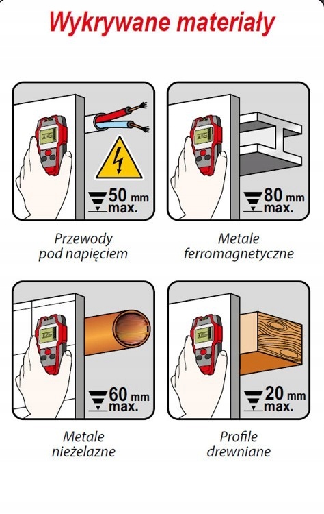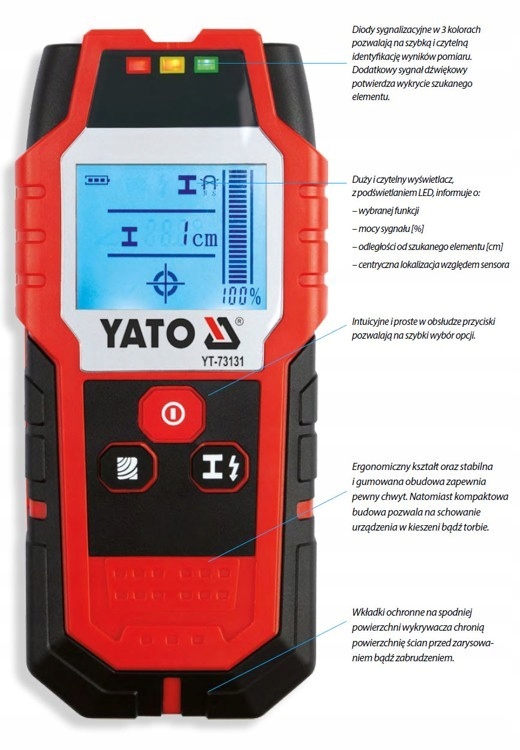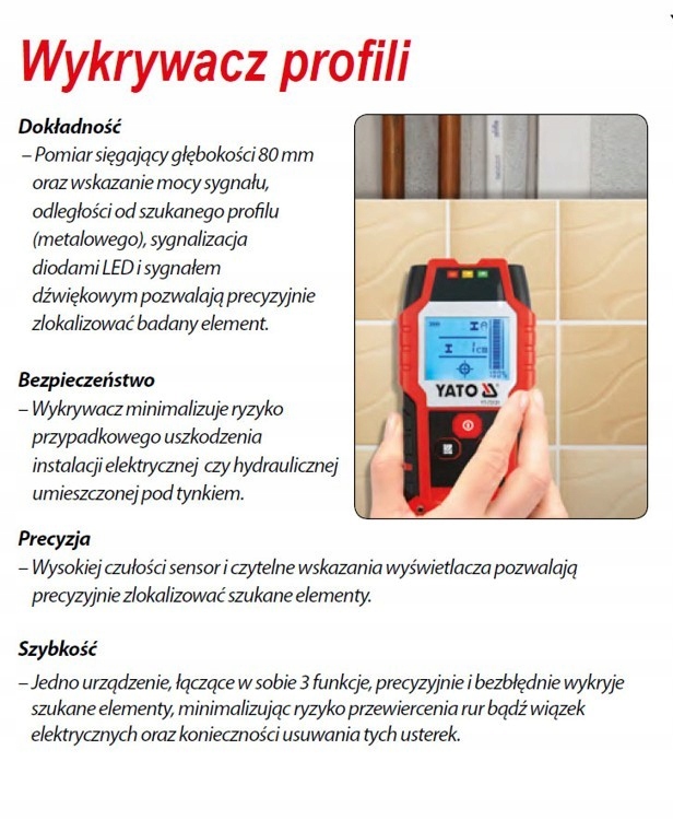 Використання детектора профілю YATO YT-73131 значно прискорює роботу, підвищує безпеку та мінімізує ризик випадкового пошкодження електричної або гідравлічної установки, розміщеної в штукатурці. Завдяки цьому ви можете, серед інших Точно просвердлите отвір, приклейте цвях і встановіть гіпсокартон у дерев’яну конструкцію. Це також дозволяє доповнити технічну документацію будівель.