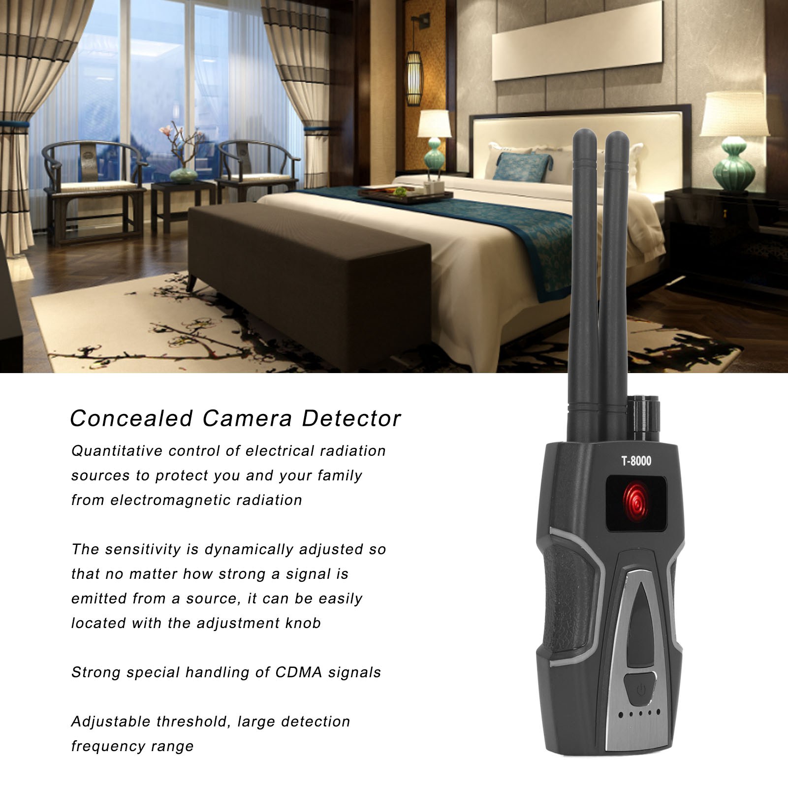 Діапазон частот: 1 МГц-8000 МГц. p>Діапазон виявлення: 2.4G: 10 м² (стандартний сигнал 10 мВ), 1.2G: 15 м² (стандартний сигнал 10 мВ), мобільний діапазон 2G, 3G, 4G сигнал, 3-15 м²