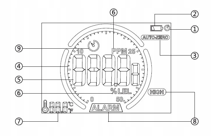 4. Кнопка зміни одиниць %LEL/PPM