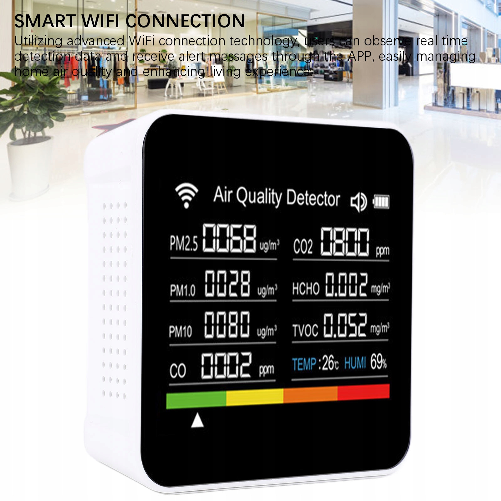 1. Універсальні функції: Інтелектуальний детектор якості повітря оснащений 14 функціями виявлення, включаючи PM2.5, LZO, температуру та вологість, задовольняючи всебічні потреби в моніторингу якості повітря в кімнатах.