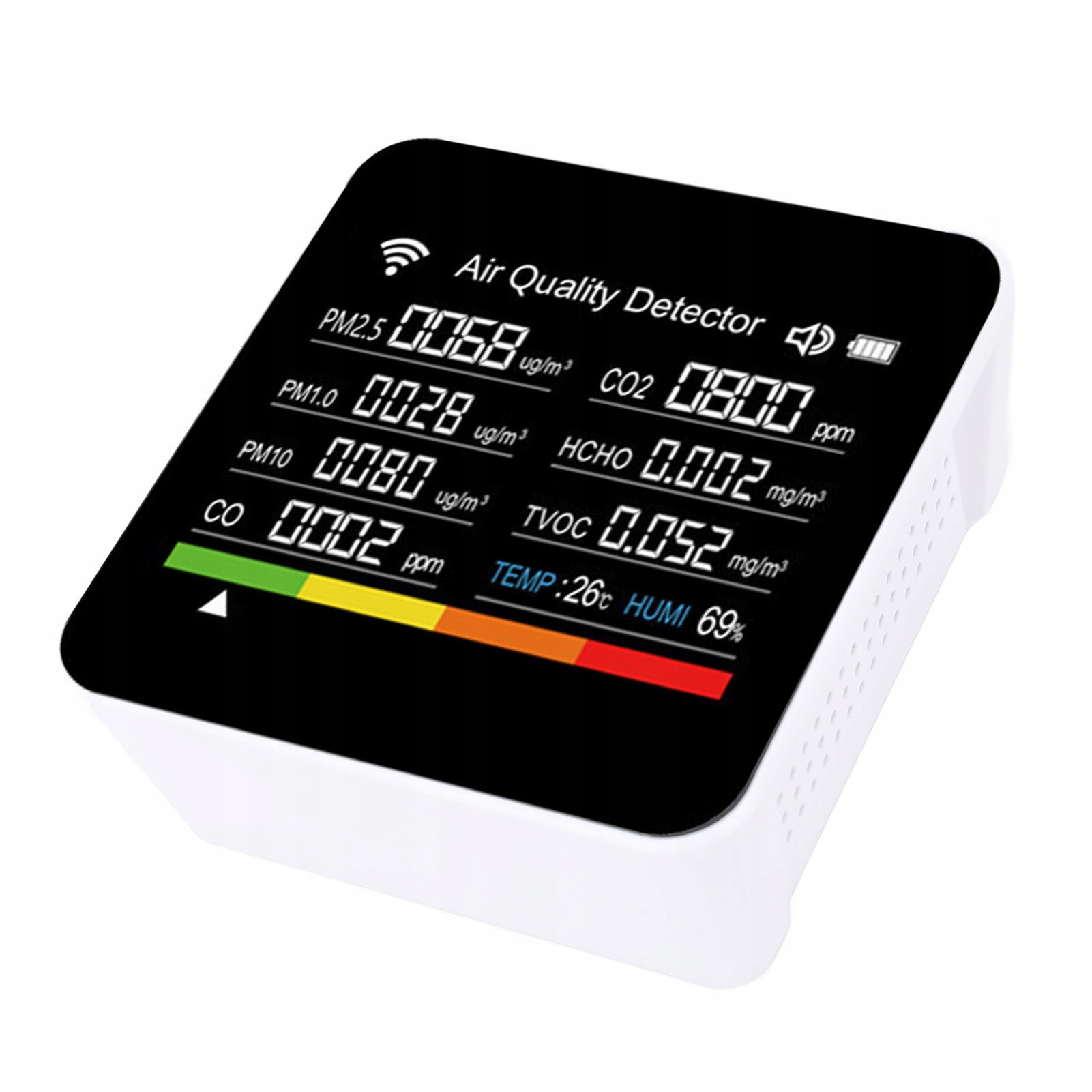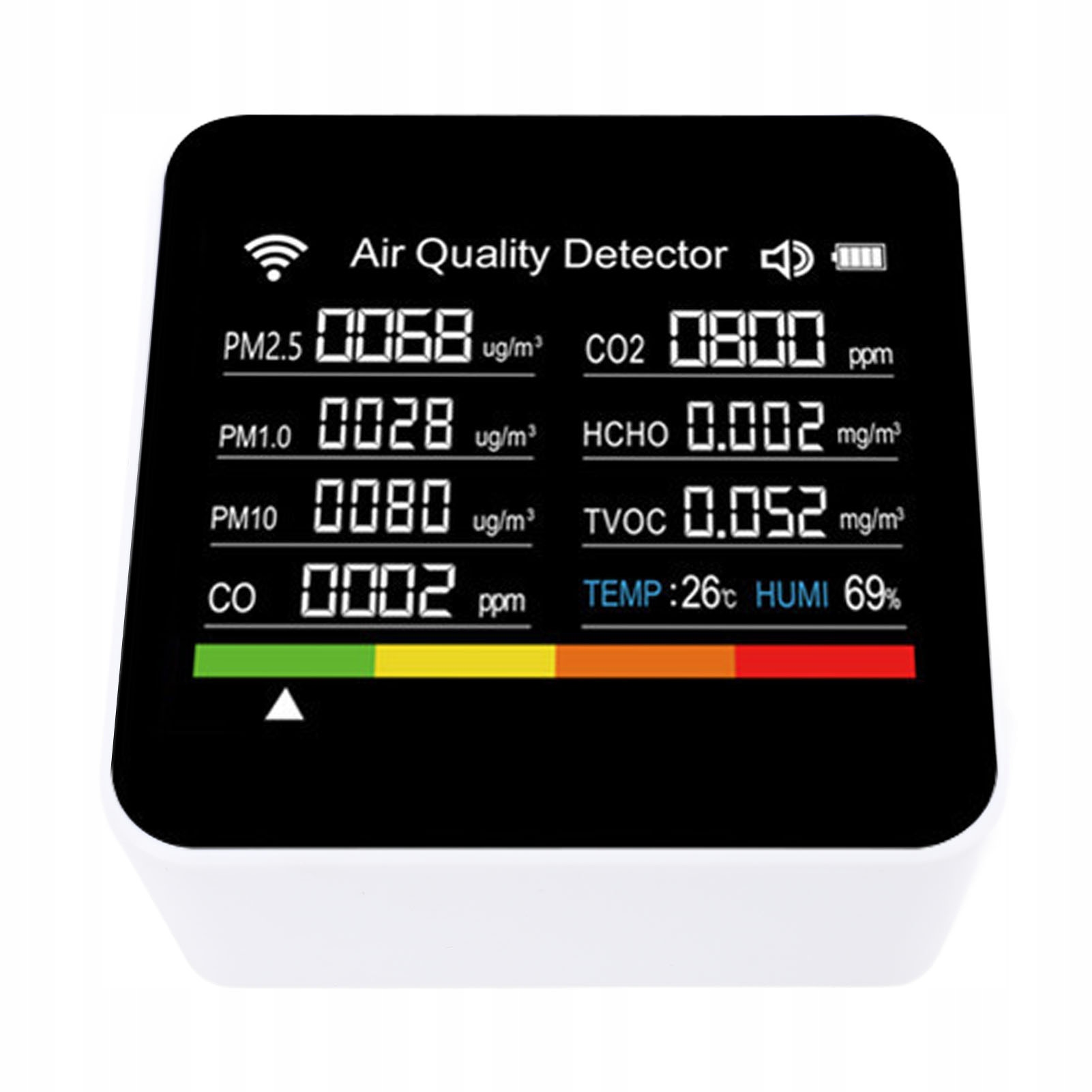 4. Компактний та портативний: Цей детектор легкий, компактний і простий у перенесенні, підходить для різних місць, таких як будинки, офіси та подорожі, що дозволяє користувачам спостерігати за якістю повітря в будь -якому місці та часу.