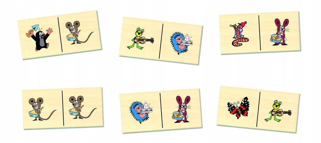 дерев'яні доміно з фотографіями Кречика та його друзів змусять вас розважитися! Набір складається з 28 каменів для гри, використовуючи шість мотивів зображення. Використовувані фарби безпечні для здоров'я. Основні особливості: Мотив Кречік та його друзі розвивають сенсоторні здібності 28 елементів, які можна зберігати в коробці з ковзаючою кришкою © Zdeněk Miler