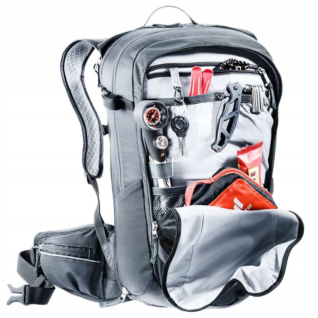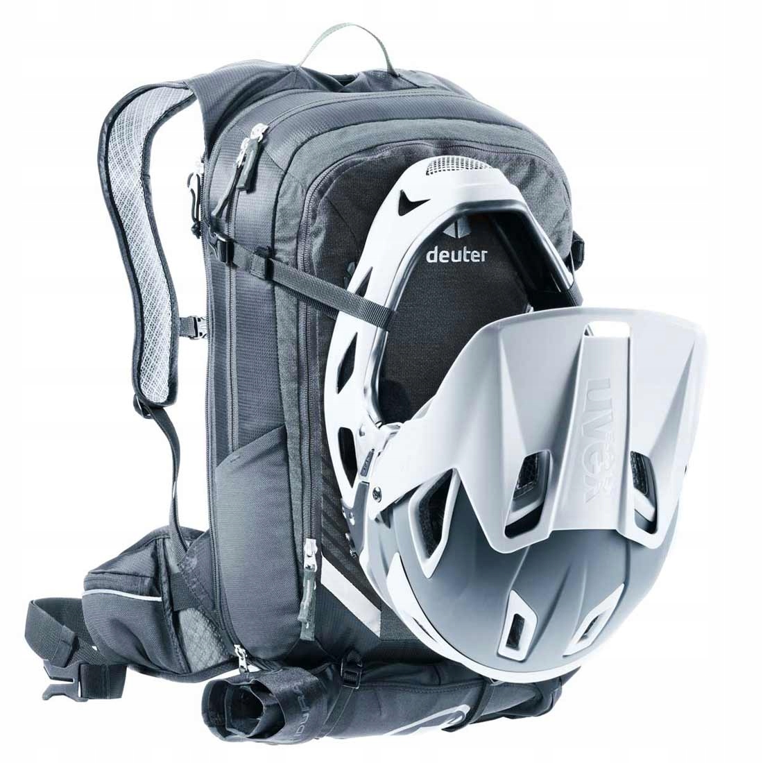 deuter compact exp 14 -це одна -шача структура з потужністю 14 літрів, яка, завдяки exp повзунку на периметрі, може бути збільшена до 19 літрів, це рішення дозволяє користувачеві регулювати об'єм рюкзака на поточні потреби та упаковане обладнання. Всередині основного відсіку, забезпеченого двома повзунками, є перегородка, який полегшує відповідне розташування аксесуарів та панель з інструкціями SOS . Ззаду, рюкзак має окрему кишеню, в якій ви можете транспортувати 3 -літер Bukon (Bukon продається окремо) або мокрий одяг. На передній частині є простора кишеня з організатором для особистих предметів, велосипедних аксесуарів та інструментів. Дві бічні гнучкі кишені та дві кишені на стегнах забезпечують місце для невеликих аксесуарів. На висоті пояса стегна є телефонна кишеня, яка дозволяє видалити і приховати його, не видаляючи рюкзак зі спини. Ручки, розміщені на передній частині рюкзака, полегшують кріплення шолома XC (перехресної кантрі), розширені бічні ремінці стиснення дозволяють прикріпити шоломи DH (під гору) або FF (Fullface). У його нижній частині є висувні смуги для прикріплення додаткового обладнання, наприклад захисники. Для того, щоб захистити від несприятливих погодних умов, рюкзак оснащений дощовим покриттям дощовим покривом . Обкладинка в яскравому кольорі, що значно покращує видимість у гірших погодних умовах, що завдяки зовнішній петлі пояса також дозволяє прикріпити велосипедну лампу або відбиваюче (моргання безпеки).
