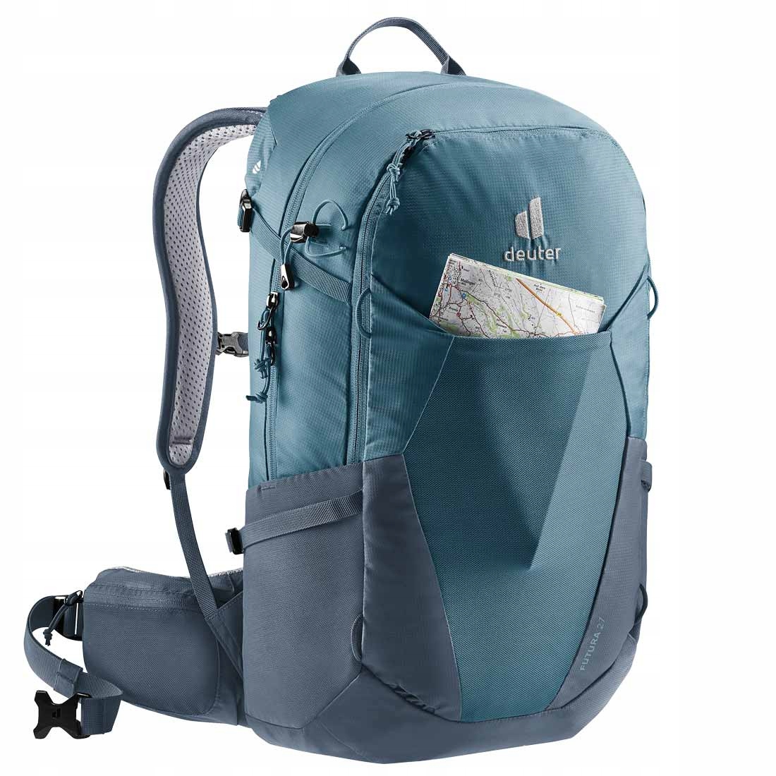 deuter futura 27 -це однооська конструкція, яка має загальну потужність 27 літрів, що дозволяє упакувати все необхідне обладнання для коротших польових поїздок. Доступ до основної камери захищений за допомогою широкої блискавки, всередині вона має окрему камеру, яка дозволяє встановити Bukon з максимальною ємністю 3 літра (баггі продається окремо). На передній частині є гнучка "мокра" кишеня та кишеня, закріплена повзунком з організатором, призначеним для документів, ключів та інших особистих предметів. У рюкзака є чотири бічні ремені стиснення, що дозволяє відрегулювати його гучність до перенесеного інвентаризації. Дві бічні гнучкі кишені вмістить додаткові пляшки з водою. Кишені, захищені повзунками, призначені для телефону та невеликих аксесуарів для рук. Він був обладнаний ремінцями для кріплення похідних полюсів та чотирьох петлей, які дозволяють прикріпити ручку на шоломі шолом Deuter (ручка продається окремо). Інтегрований дощовий покрив захищає рюкзак та його вміст від несприятливих погодних умов.