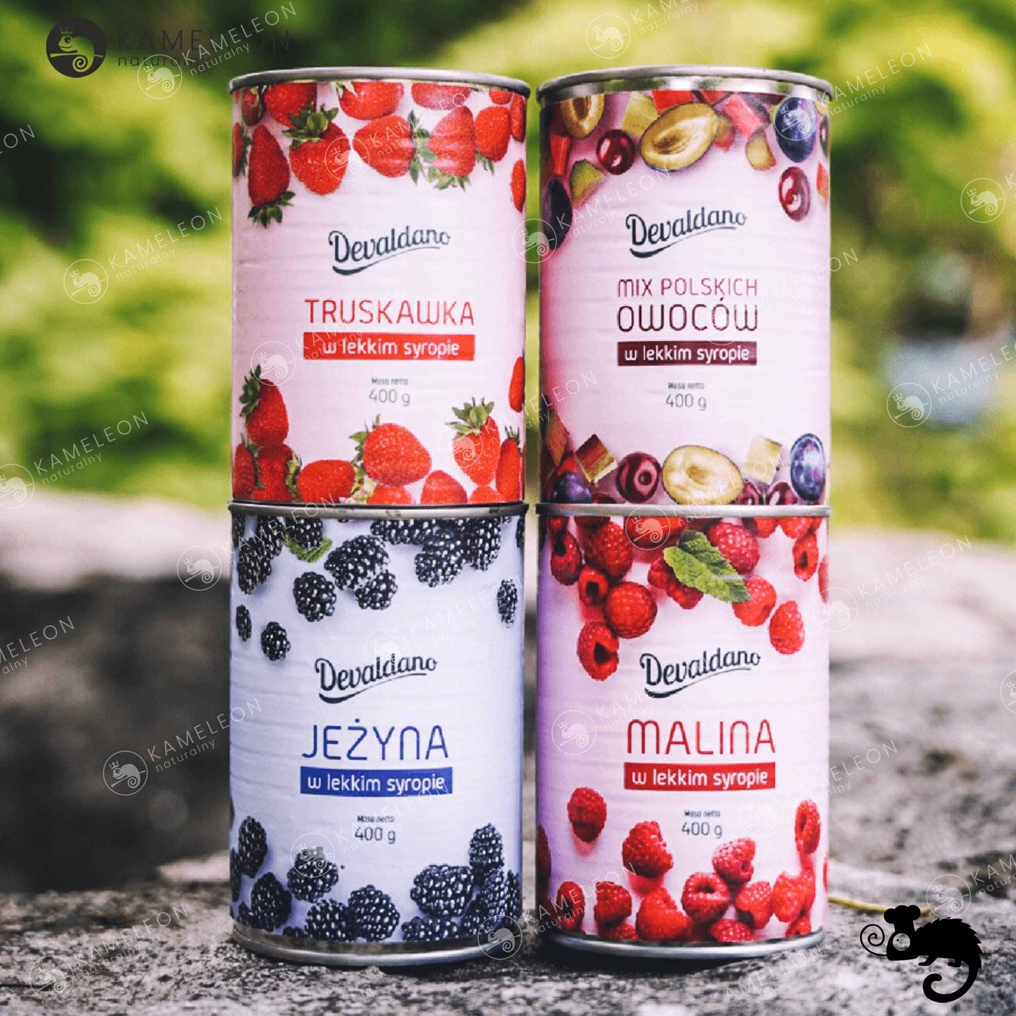 Фрукти в легкому сиропі Devaldano: Малина, МІКС польських фруктів, Ожина, Чорниця, Полуниця. Перегляньте їх усі та спробуйте на своїй щоденній кухні для тортів, морозива та коктейлів. Фрукти в сиропі - це незамінний інгредієнт, з якого можна приготувати безліч смачних гарячих і холодних страв. Ви можете вживати сироп і фрукти разом або окремо. Ознайомтеся з нашими готовими рецептами та знайдіть власний спосіб приготування смачних фруктів у легкому сиропі.