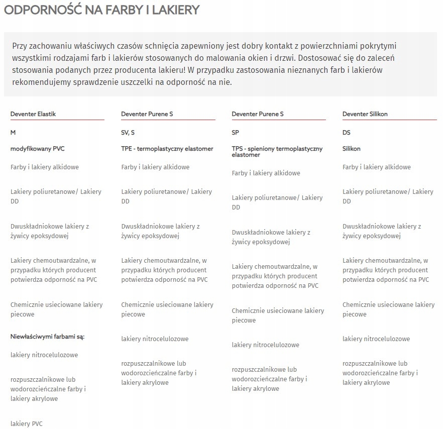 При дотриманні відповідного часу висихання забезпечується хороший контакт з поверхнями, покритими всіма типами фарб і лаків, які використовуються для фарбування вікон і дверей. Дотримуйтесь рекомендацій щодо застосування, наданих виробником фарби! Якщо використовуються невідомі фарби та лаки, рекомендуємо перевірити пломбу на стійкість до них.