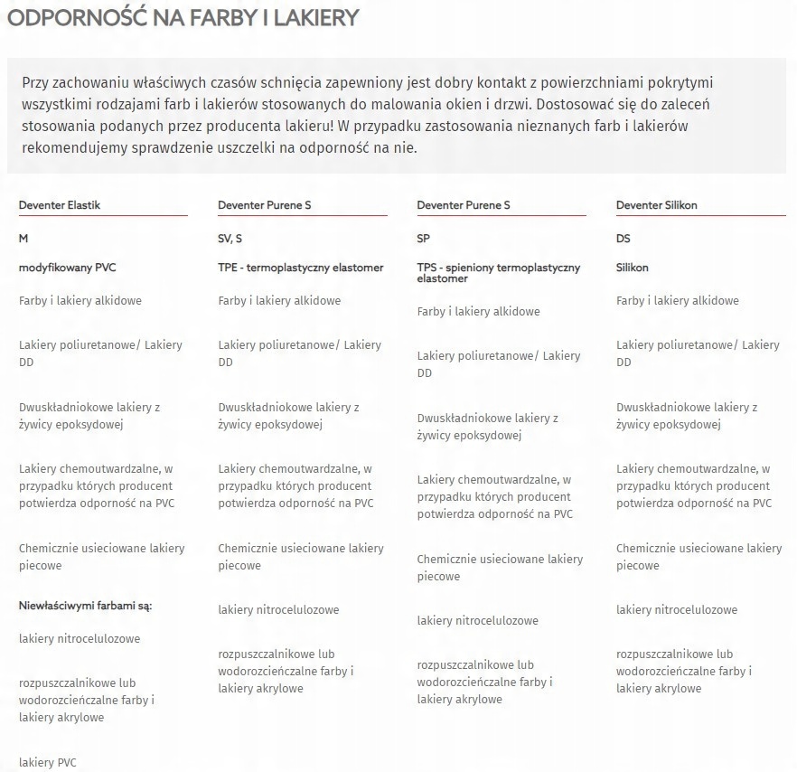 Підтримуючи належні часи сушіння, забезпечується хороший контакт з поверхнями, покритими всіма типами фарб і лаком, які використовуються для малювання вікон та дверей. Адаптуйте до рекомендацій використання виробника лаку! Якщо використовуються невідомі фарби та лаки, рекомендуємо перевірити печатку на стійкість до них. 4 Хімічно насичені лаки печей