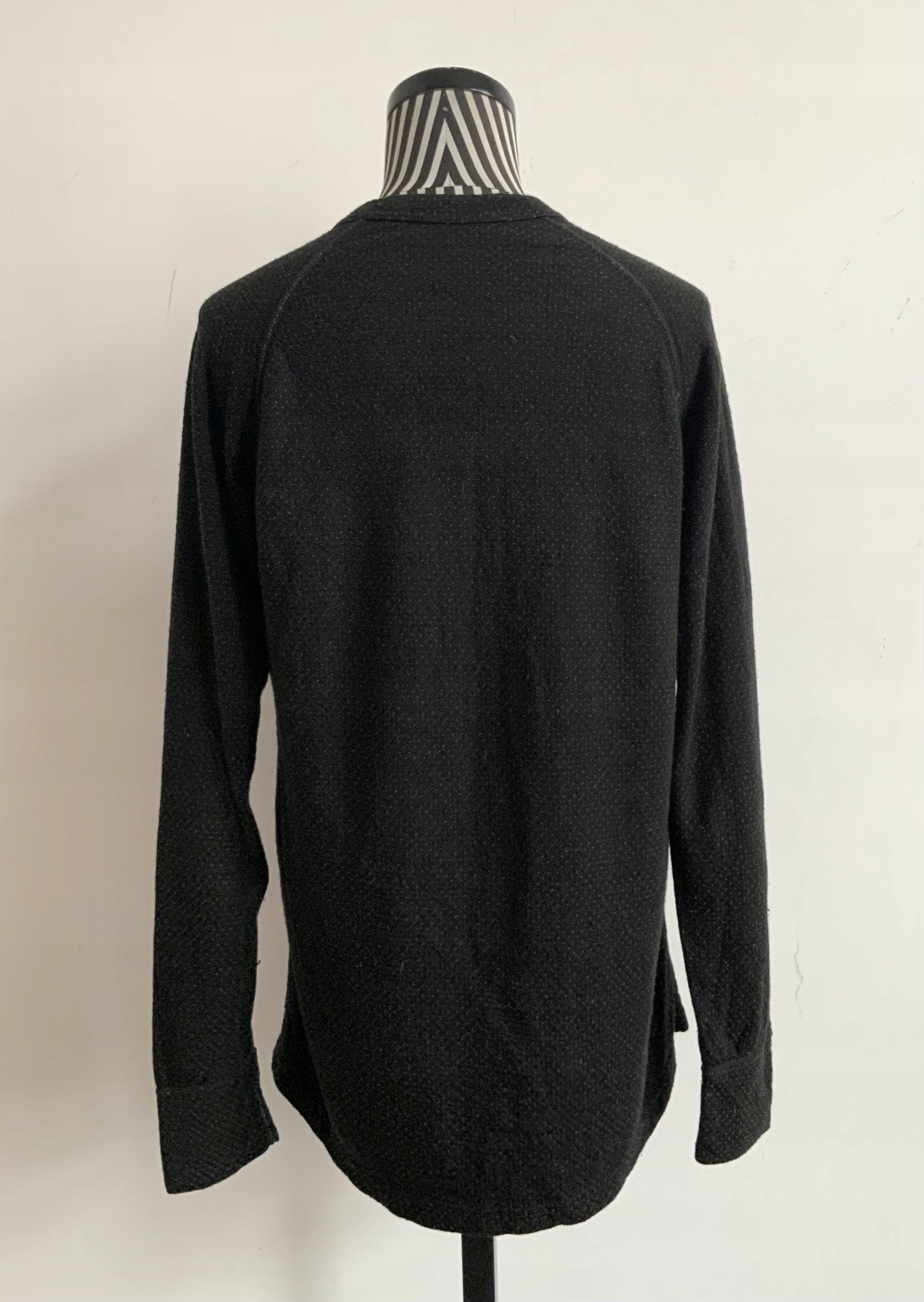 Двоєрмоактивна блузка з довгими рукавами з 80% мериносною мериносною вовни в чорному сірому. Зовнішній шар з 80% вовни меринос з домішкою 20% поліаміду. Внутрішній шар поліестеру термоліт (поліефірний термоліт відбиває вологу від шкіри і забезпечує чудовий тепловий комфорт). Плоскі шви. Задній довше. Рухи Раглана. Дуже хороший стан.
