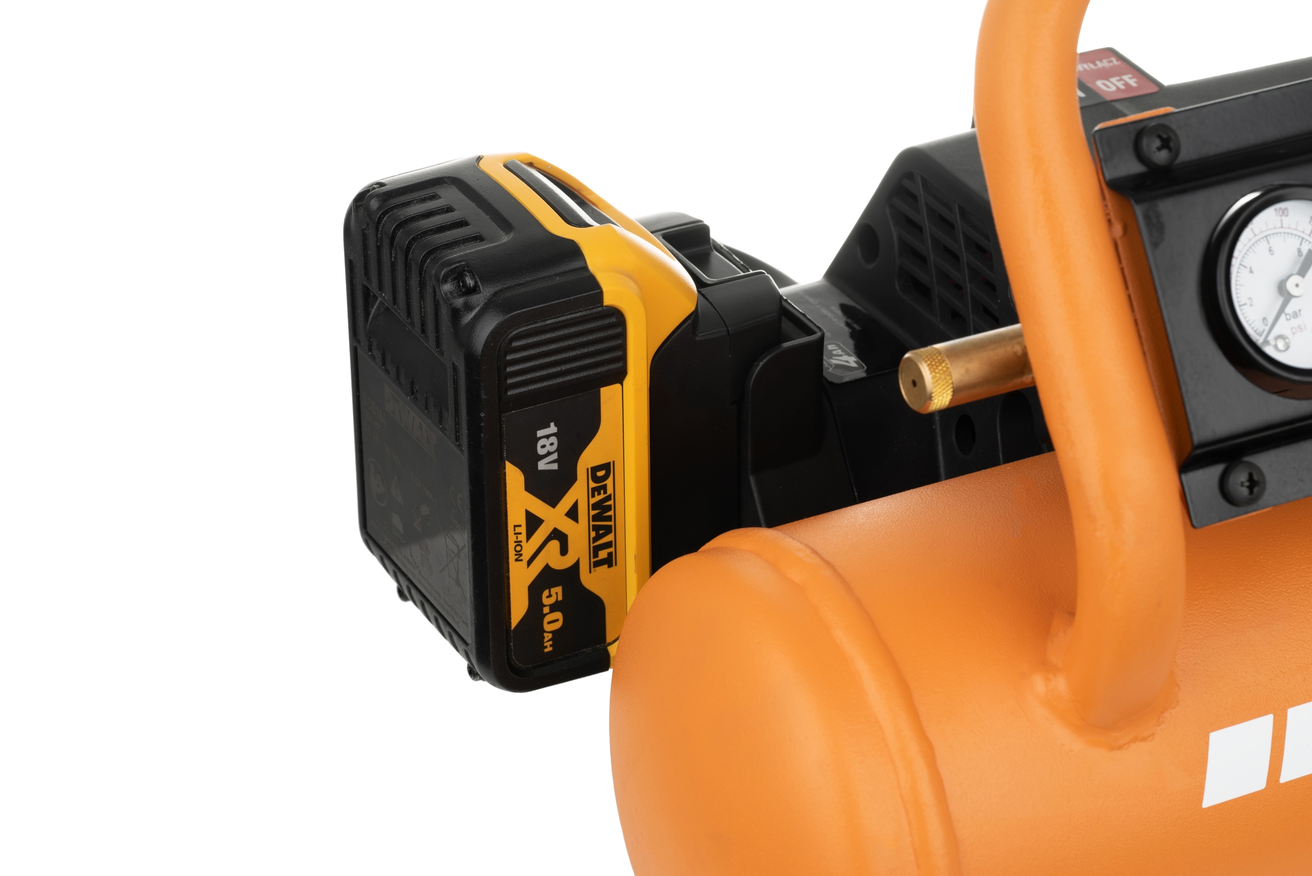 Адаптер, що входить у комплект, дозволяє використовувати будь-який акумулятор DeWalt 18V для живлення компресора.