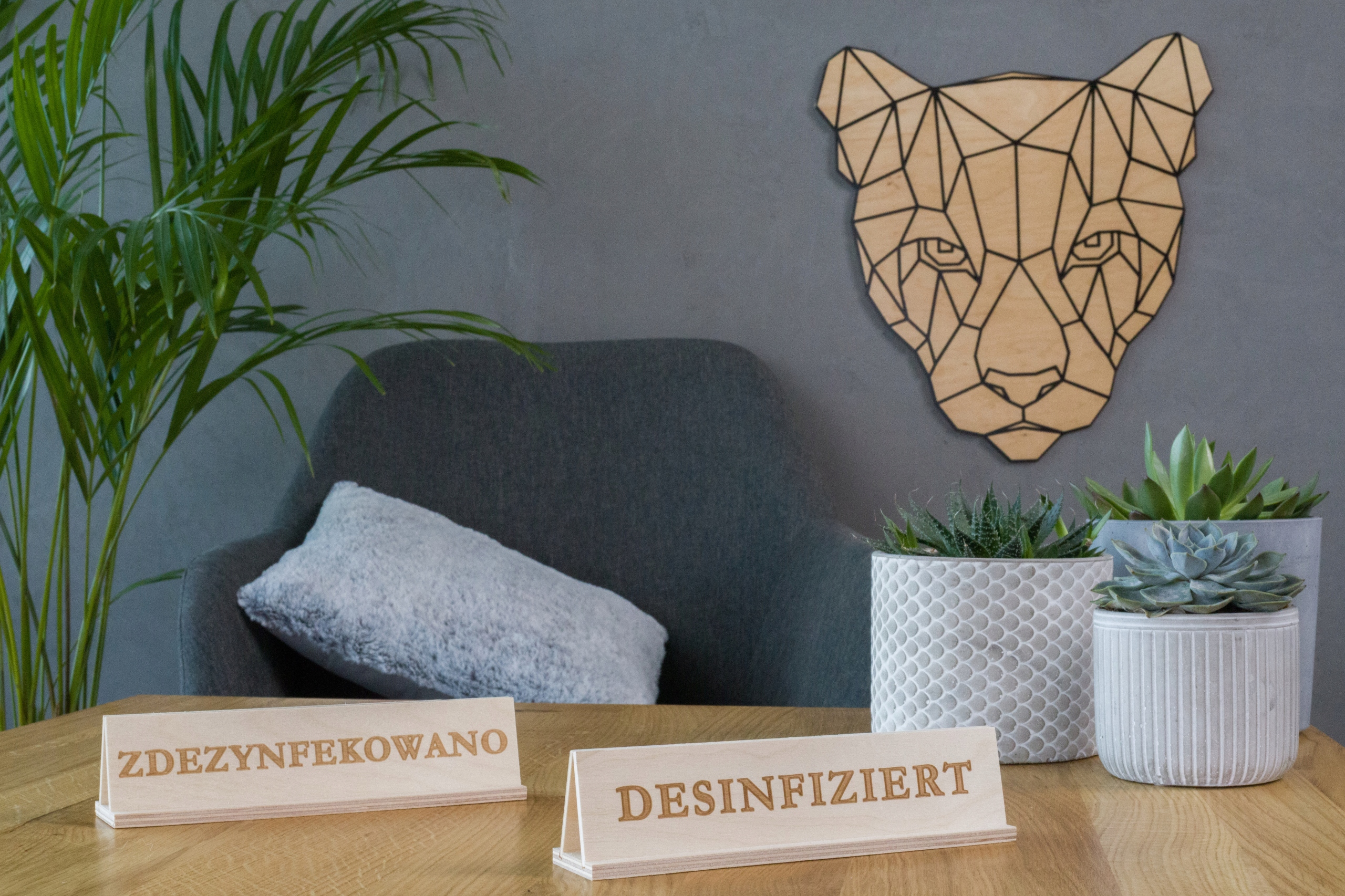 Дві дерев'яні таблички, прикріплені до твердої основи з чіткими вигравіруваними написами ZDEZYNFEKOWANO / DESINFIZIERT